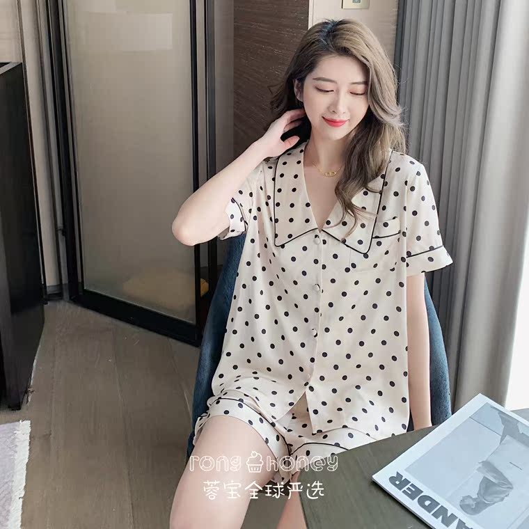 Japanese polka dot ice silk pajamas women's summer thin section playful temperament simulation silk short-sleeved homewear suit