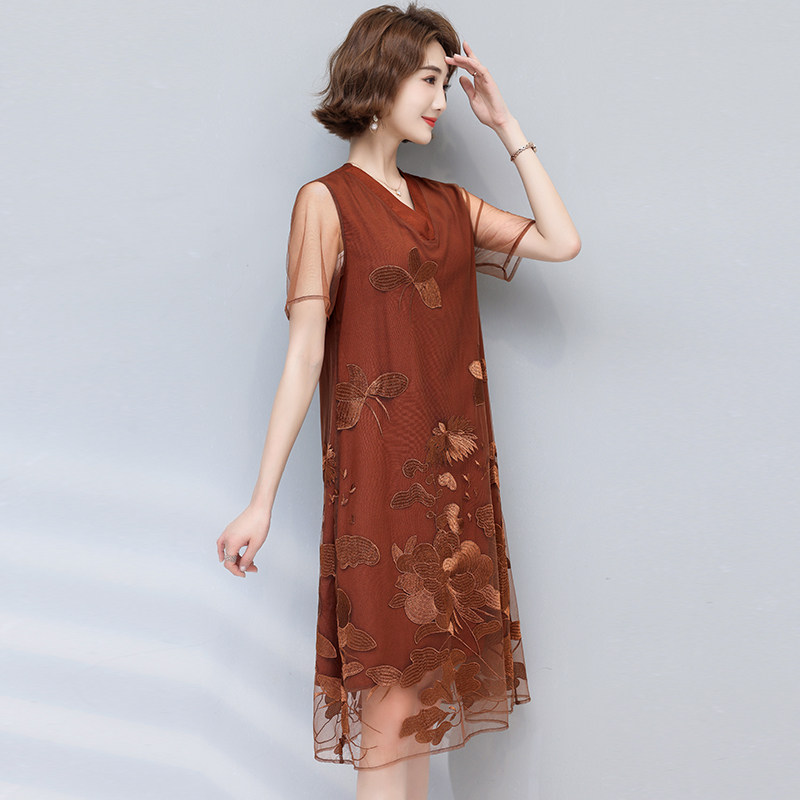 Short sleeve snow spinning dress female to send a new mom fashion temperament mid - long - page web dress in the summer of 2021