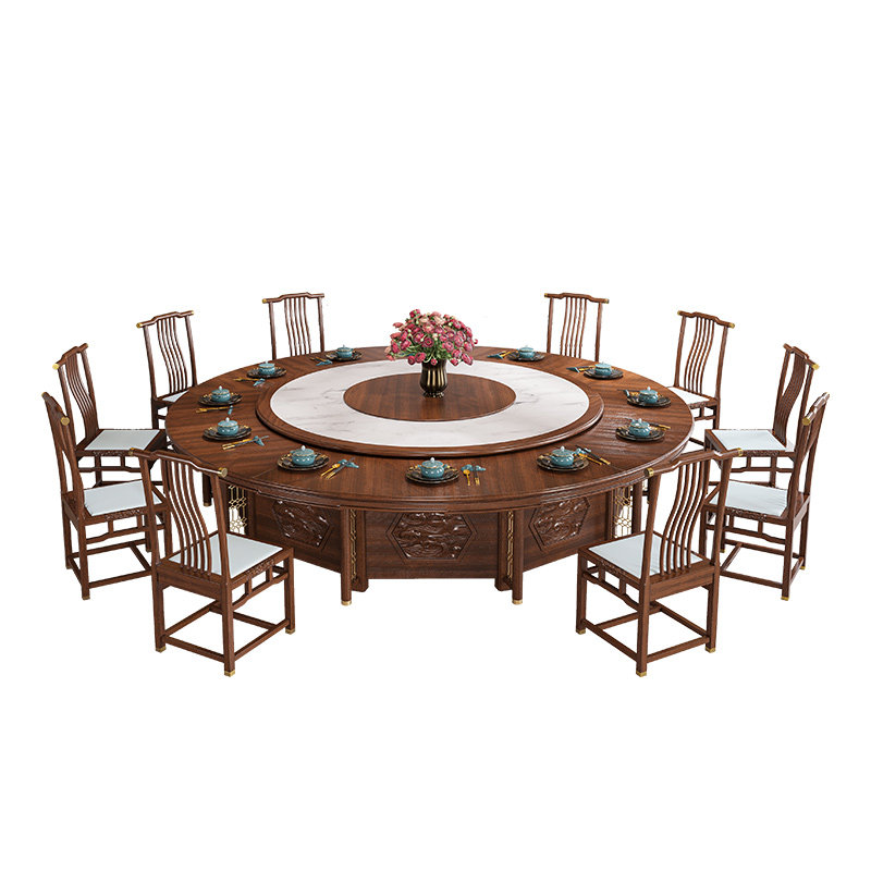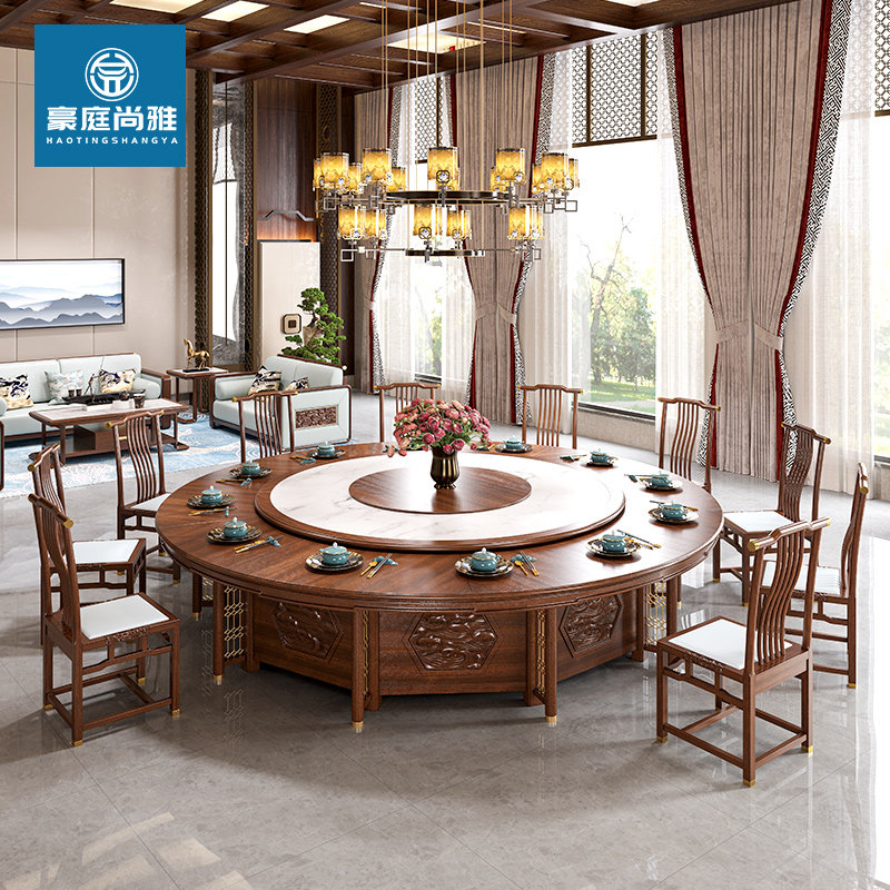 Hotel Dining Table Large Round Table Villa Clubhouse Dining Room 20 People New Chinese Solid Wood Rock Plate Electric Rotary Hotpot Table