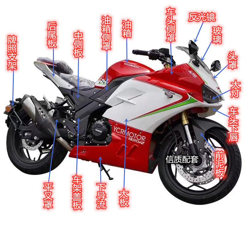 Reflective mirror (1 pair) head hood head lower lip side sideboard (1 pair) lower diversion (1 1 pair) front fender rear rear plate (1 pair) rear tail ultra-connected glass meter cover tank sideboard (1 pair)
