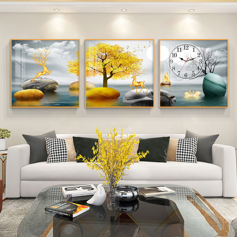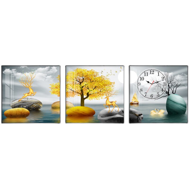 Living room decorative painting triple mute wall clock stone to run the mural hour hand hanging painting clock sofa background crystal porcelain painting