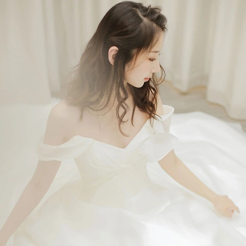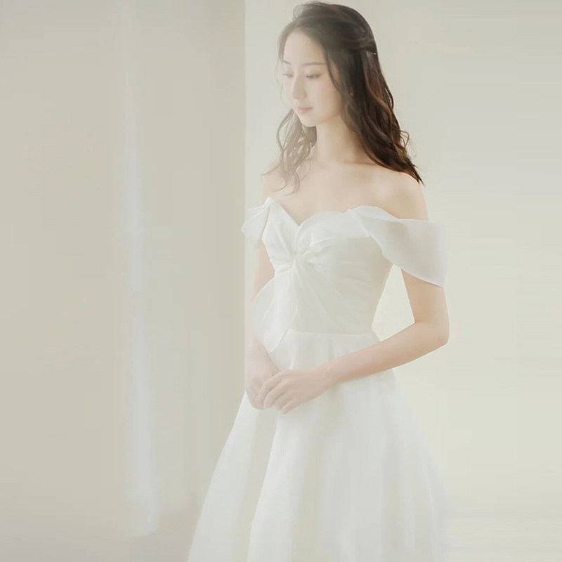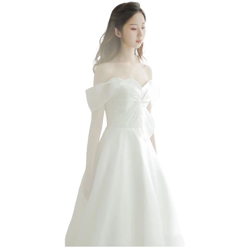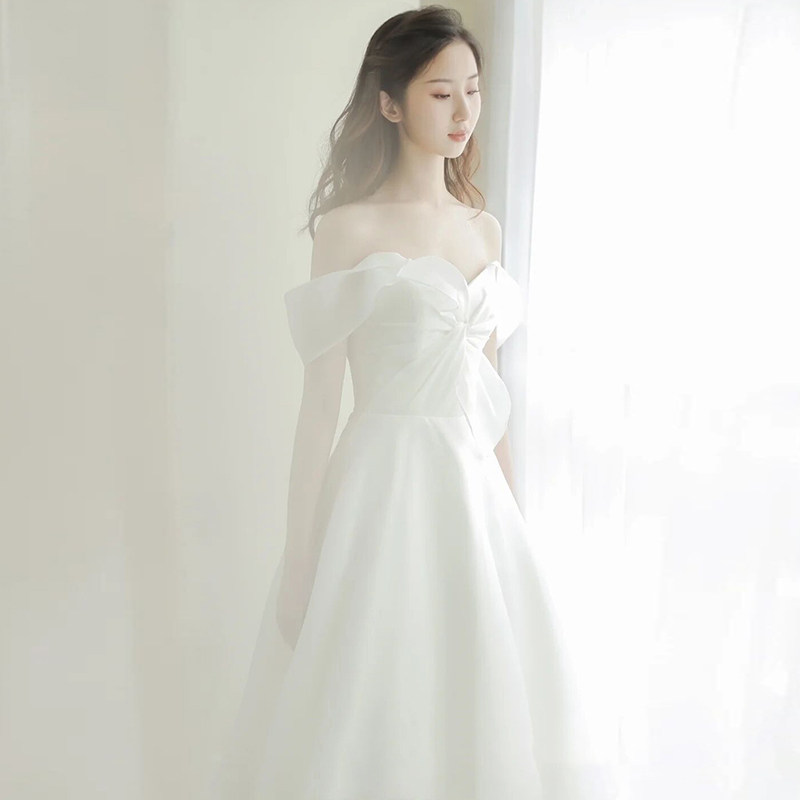 Fan-style white light wedding dress 2022 new satin lined with a shoulder retro neckline to register a small gown to go out for spring and summer