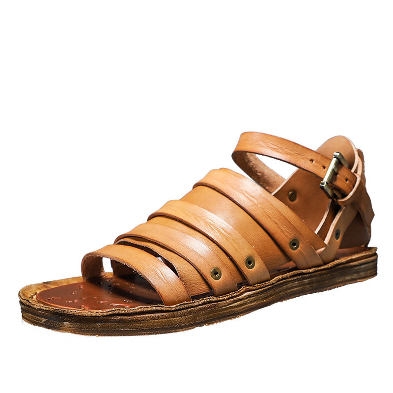 Original handmade vegetable tanned leather British retro men's Roman sandals summer flat with comfortable breathable beach shoes tide