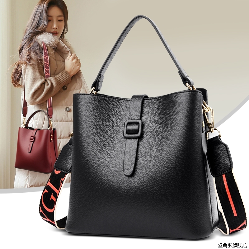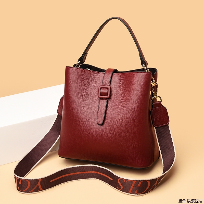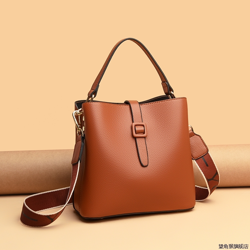 Leather bucket bag 2022 new large-capacity mommy handbag leather wide shoulder strap single shoulder messenger bag