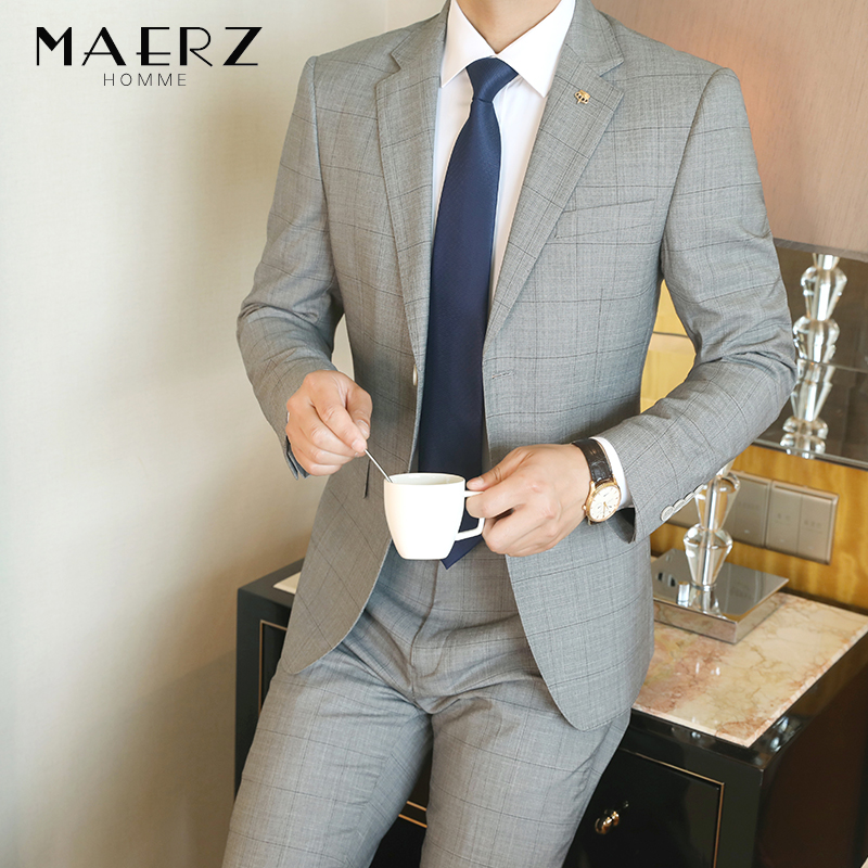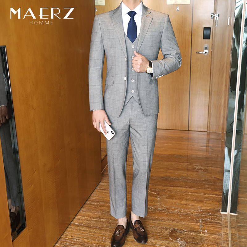 Summer thin suit men's three-piece Korean version slim gray plaid professional formal dress groom married