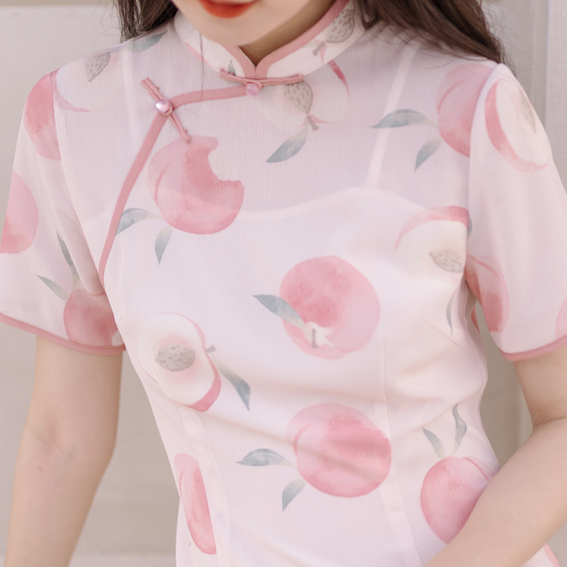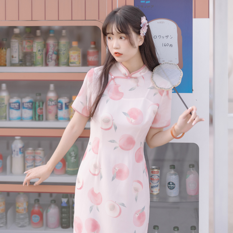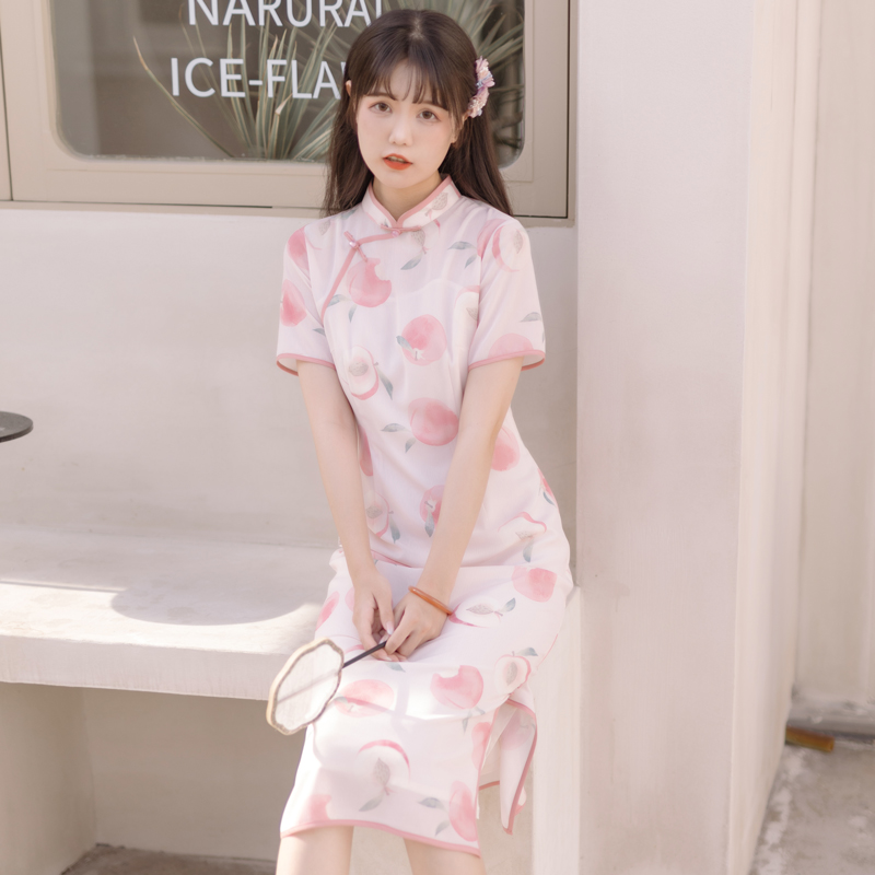 Sichuan Dai time: Sweet Peach National Wind Teenage Girl Qipao Fake two water honey peach printing medium long version qipao foreign dress