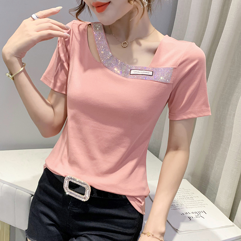 Tide Card 2022 Summer New Sexy Hollowed-out Collarbone T-shirt Woman Fashion Hot Drill Pure Cotton Display Slim Short Sleeve Blouse