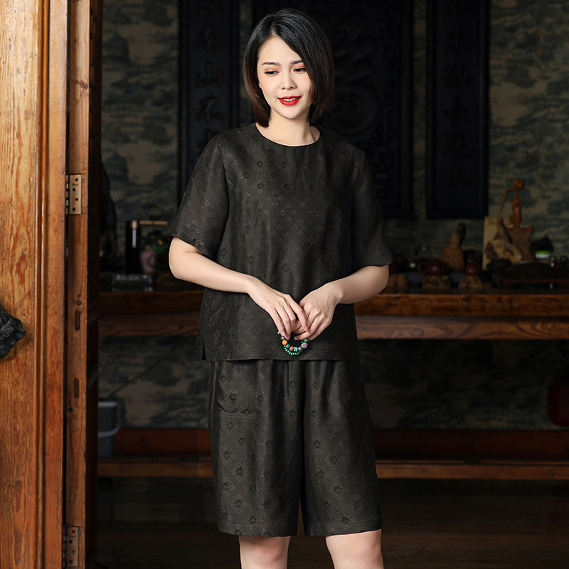 Silk floro fragrant cloud yarn Chinese style suit mulberry silk through hole Roof summer retro two-style blouse trousers women's clothing