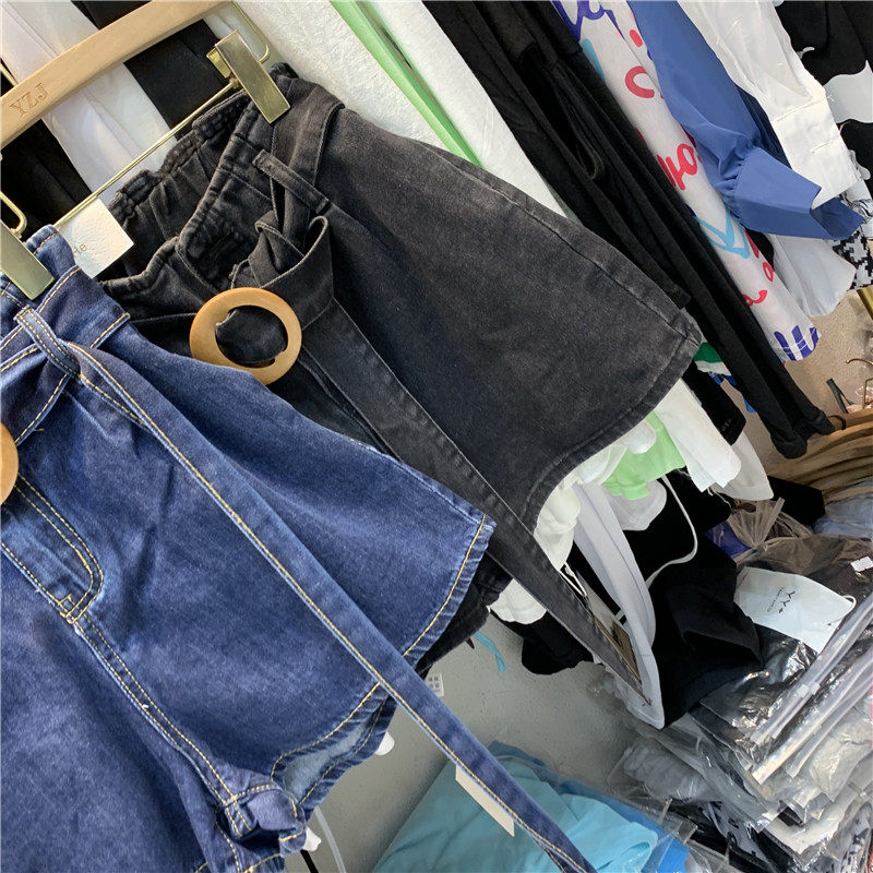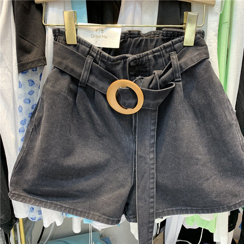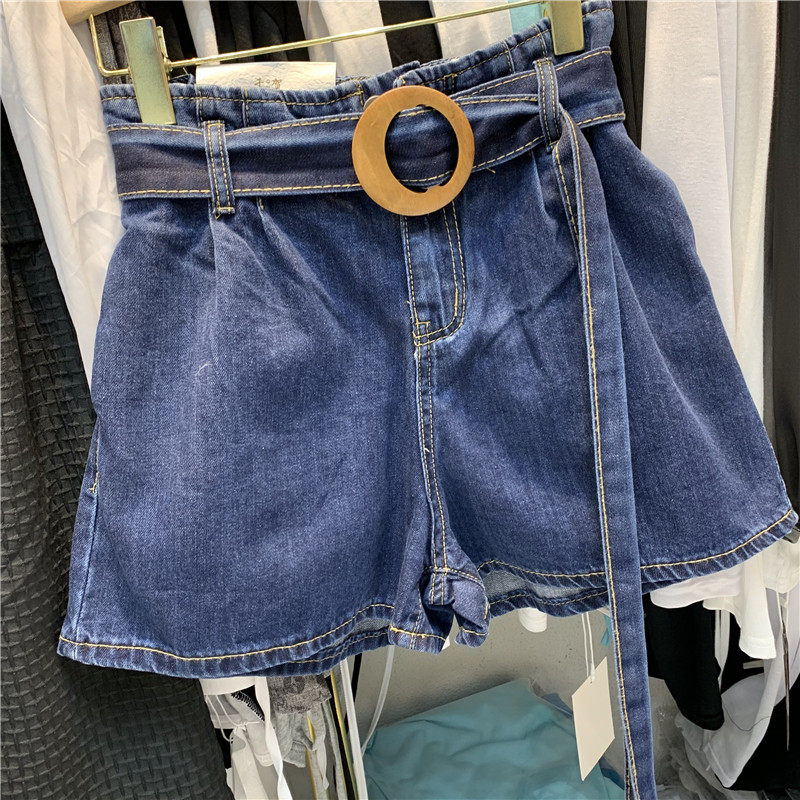 Q H Qianhe 91068 summer Western style playful round buckle belt elastic waist flower bud A-word blue denim shorts women