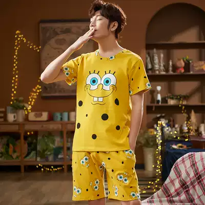 Pajamas men summer short-sleeved shorts cotton thin set for boys and teenagers students