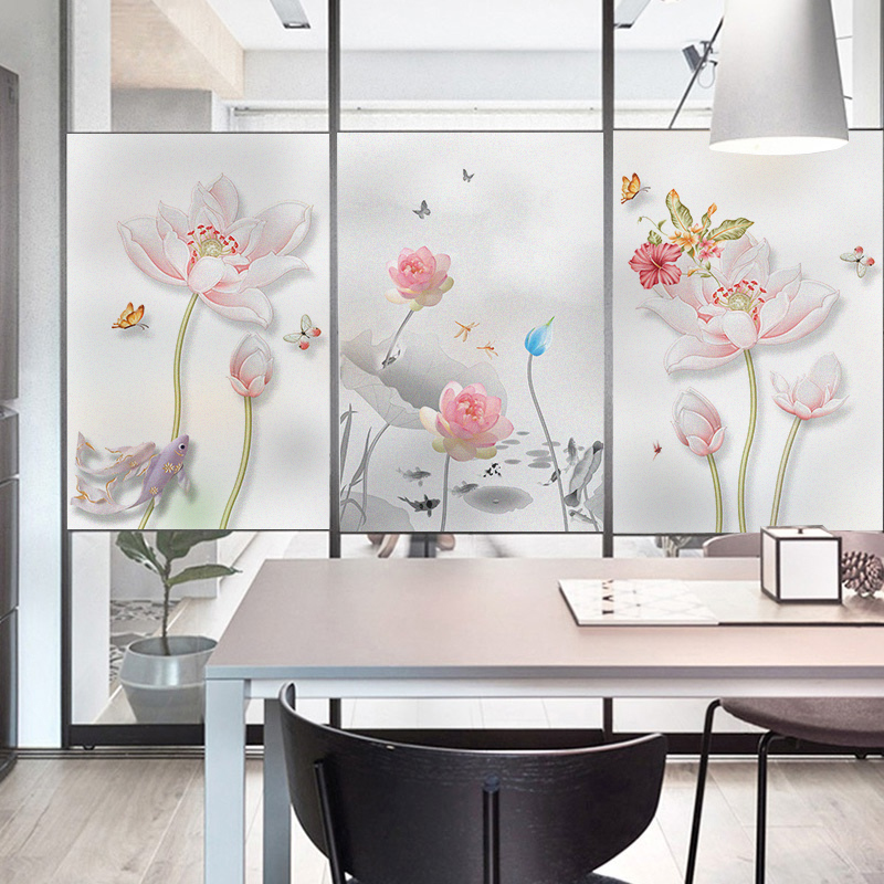 Window Frosted Glass Stickers Shade Anti-Peep Makeup Room Bathroom mobile door sunscreen New Chinese Scenery Lotus Flowers