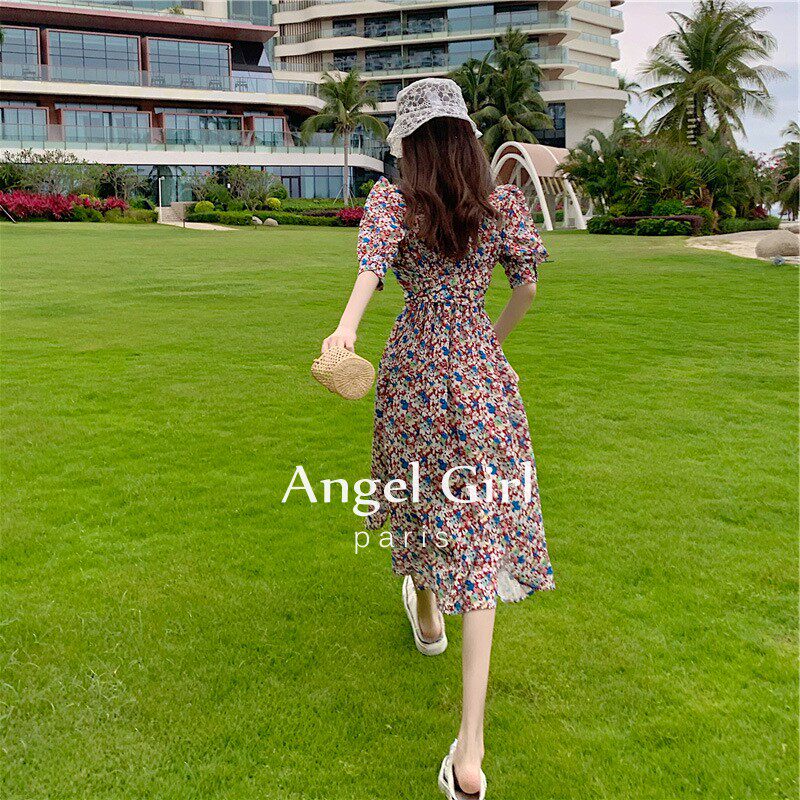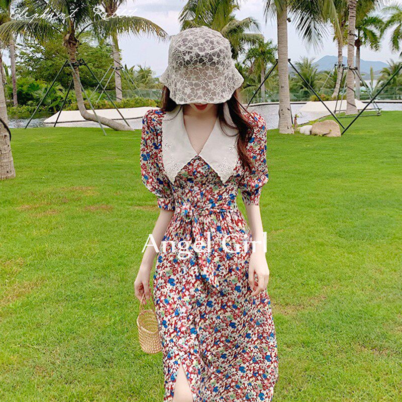 Sandro Duffy French holiday style doll collar Sweet lace-up waist small floral dress summer