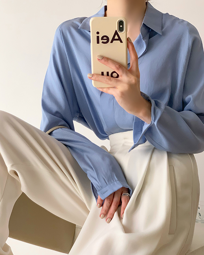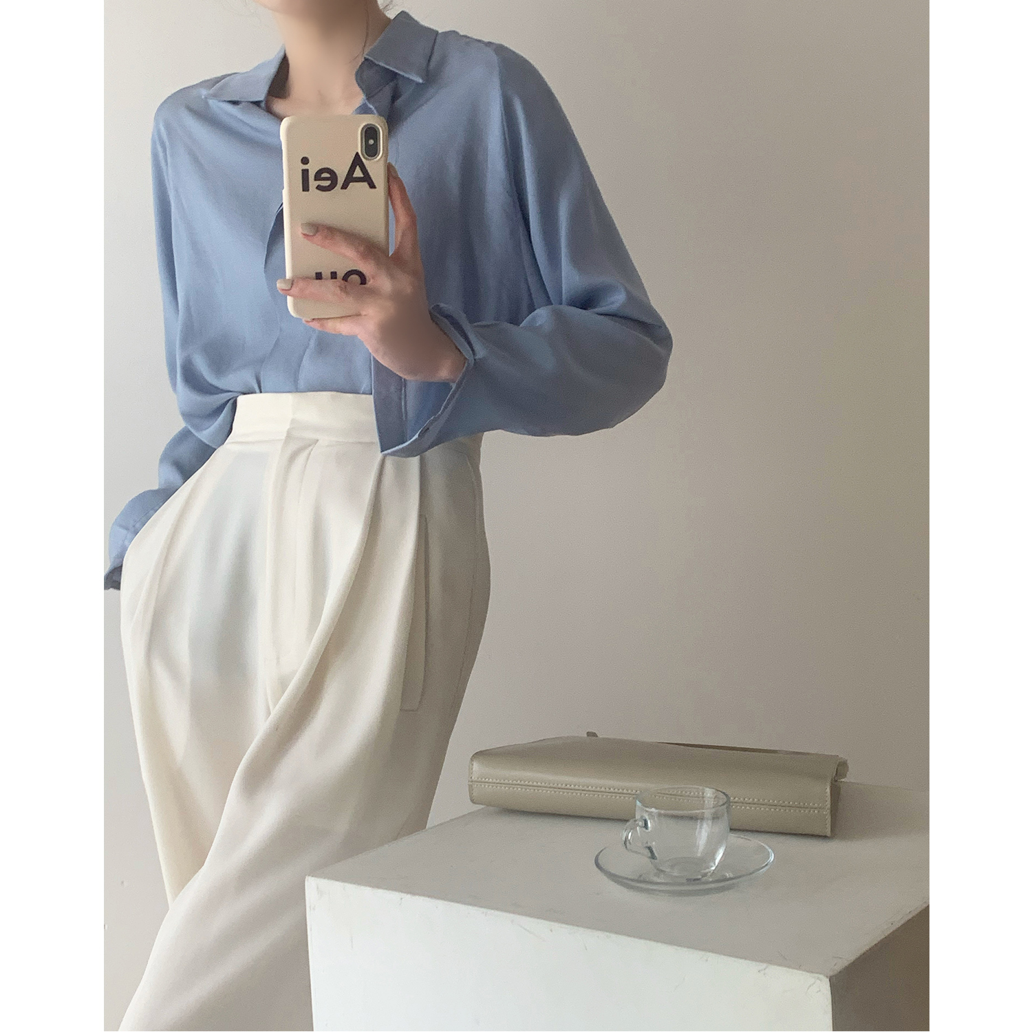 Blue drape V-neck shirt women's design sense niche temperament commuting lazy wind long-sleeved chic intellectual top thin