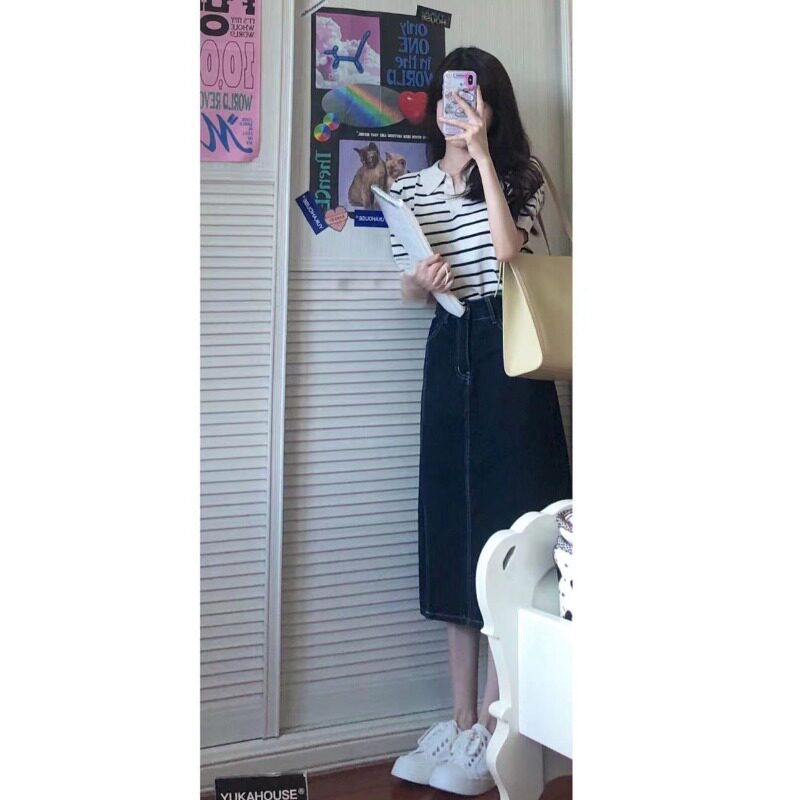 Striped T-shirt (light cooked, Hong Kong flavor, occupation, sweet, fresh, college style, complete set, pure desire hot girl, summer suit, female summer, royal sister fried street, casual fashion), denim skirt (salt series)