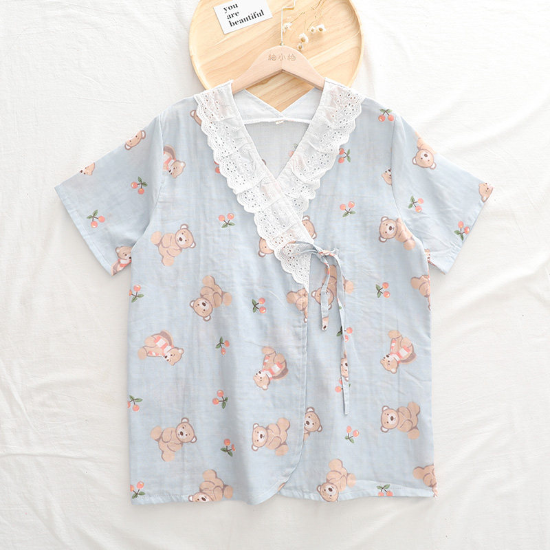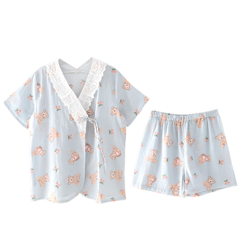 Summer thin cotton gauze cute Japanese milk buddy bear short sleeve shorts and dress nightclothes home suit woman