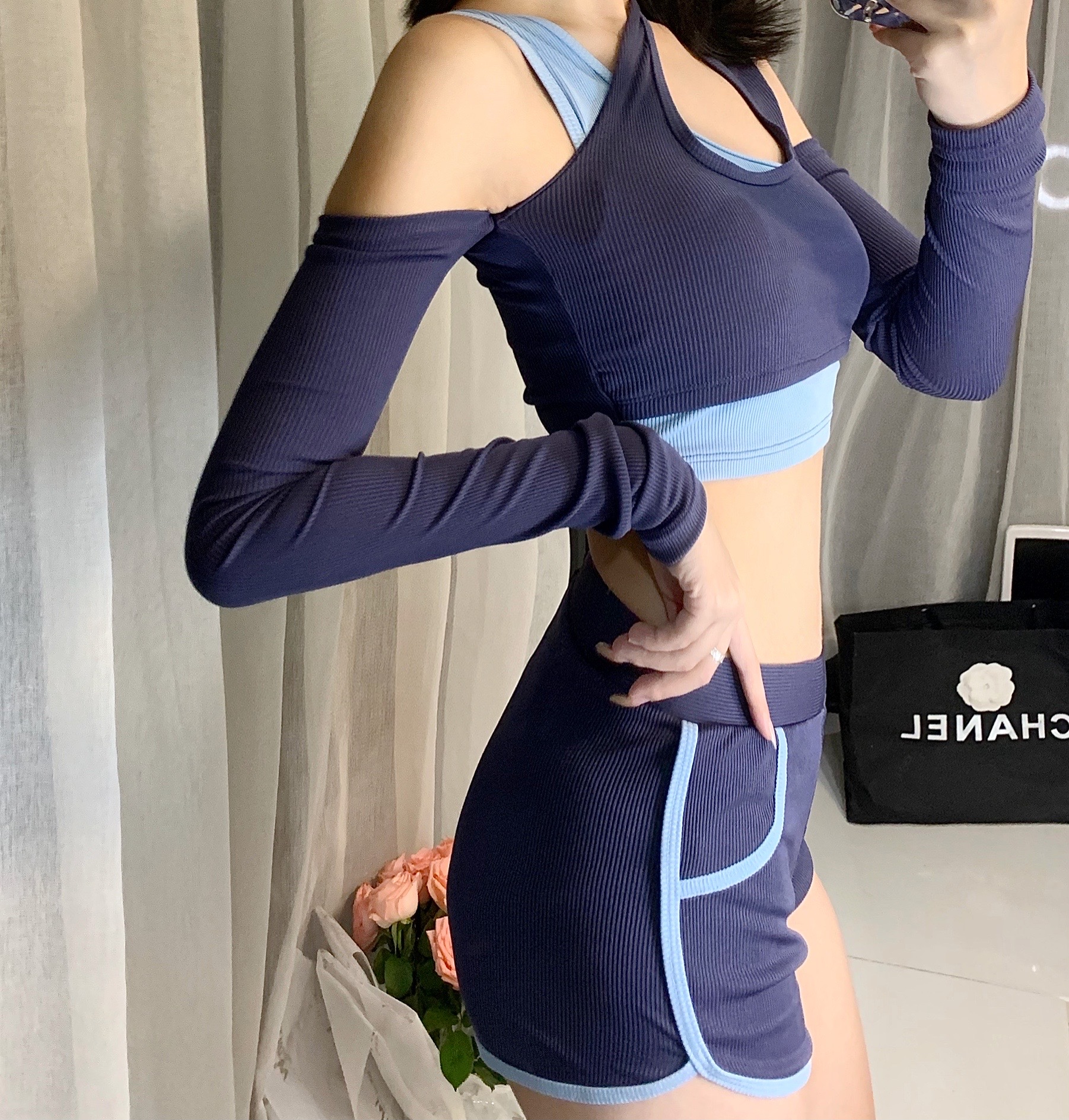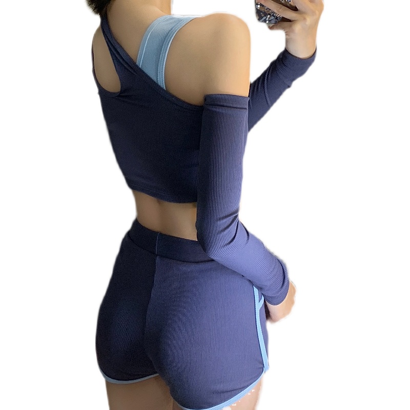 Shikeer long sleeve blue slanted shoulder sports flat corner diving sunscreen belly shoulder belly split swimsuit three-piece summer