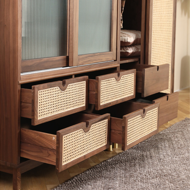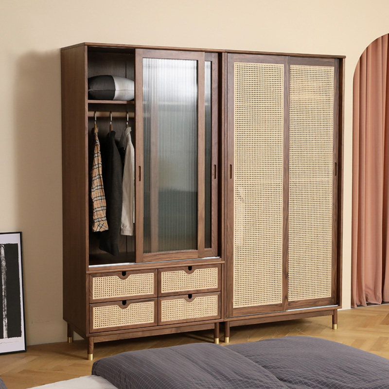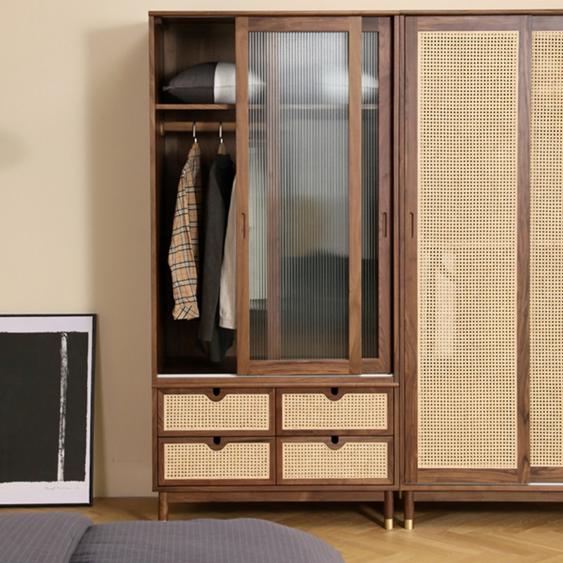 North American black walnut rattan wardrobe bedroom glass home wardrobe multifunctional flat door simple solid wood cabinet - Taobao