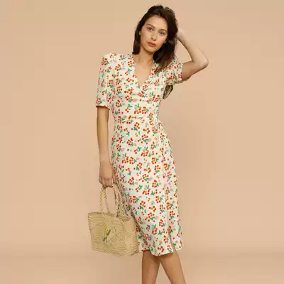 French Rouje French vintage floral dress cherry print slim V-neck one-piece tea break skirt