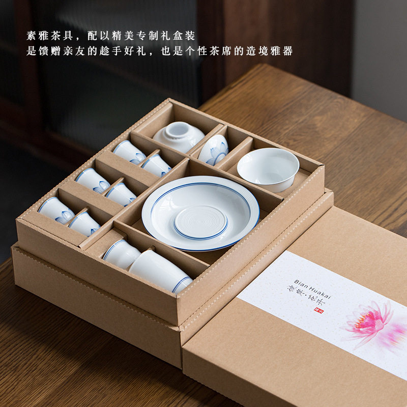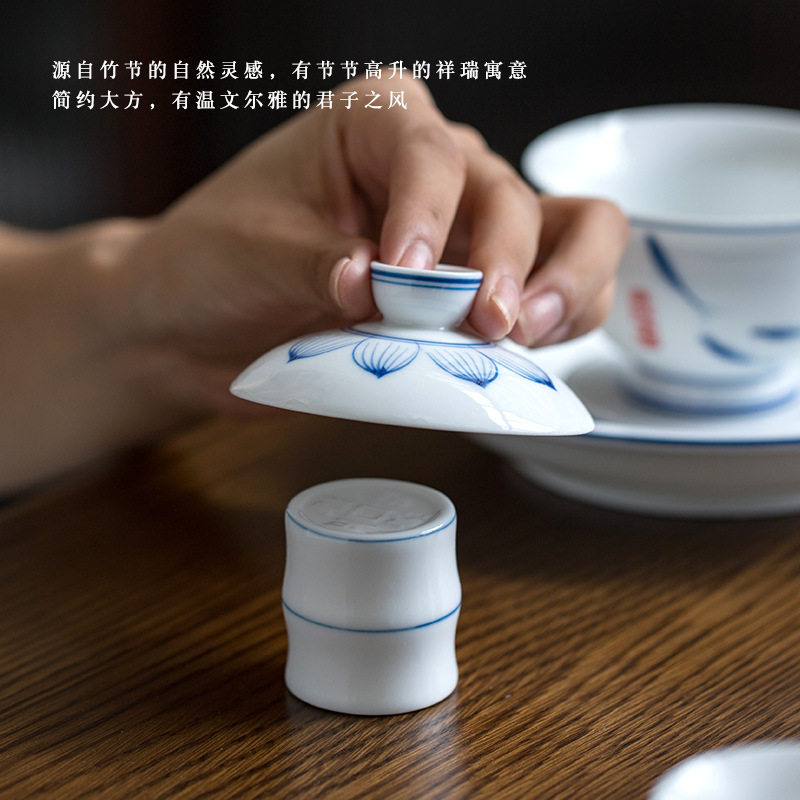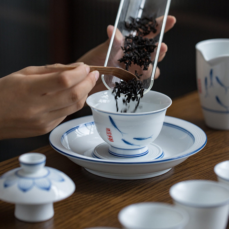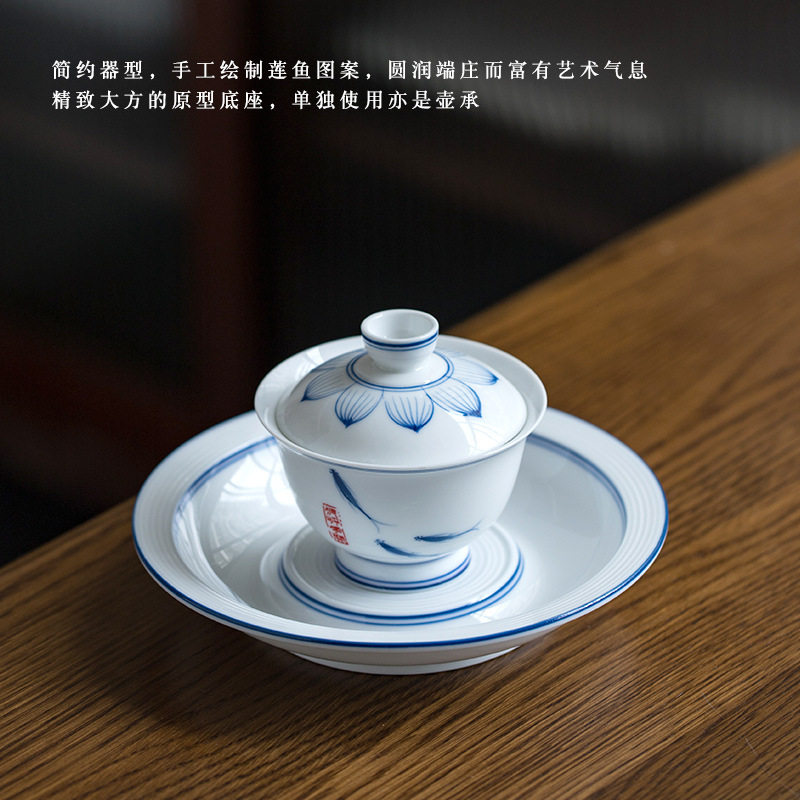 Hand-painted fish play blue and white cover bowl Kung Fu tea set set Jingdezhen tea set white porcelain tea cup justice cup three talents cover bowl
