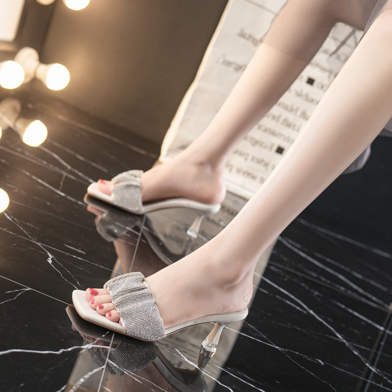 Fashionable all-match stiletto sandals women's summer wear 2021 new spring Dadong fairy rhinestone square head net red slippers women