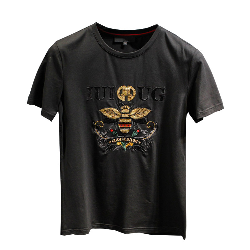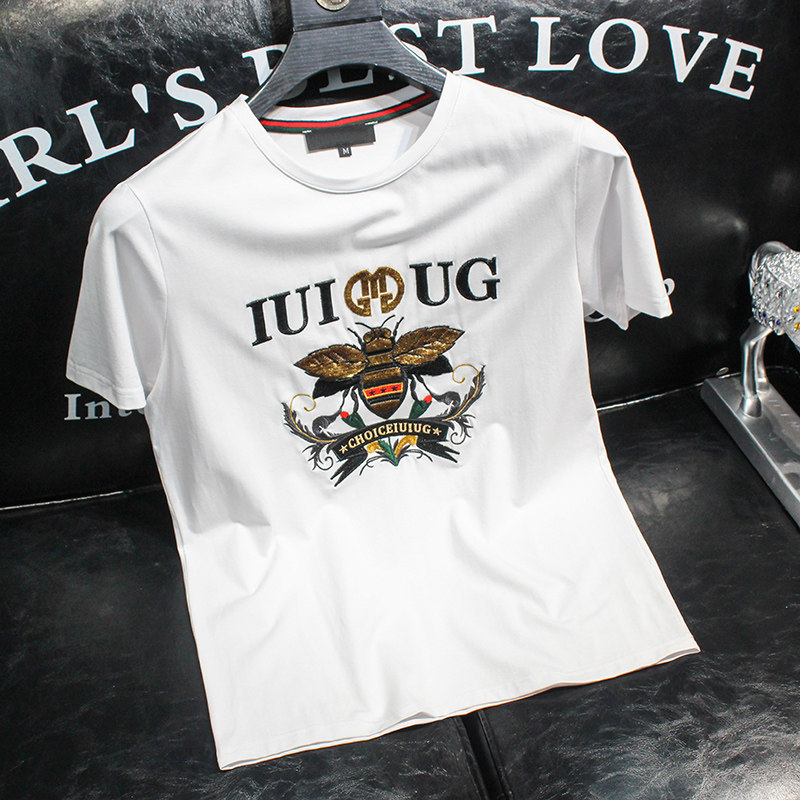 European Station short sleeve T-shirt men's summer thin bee embroidery print trend fashion mercerized cotton body shirt men