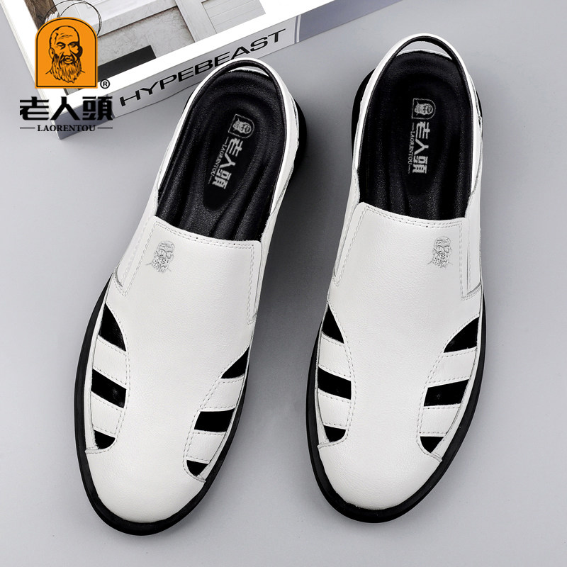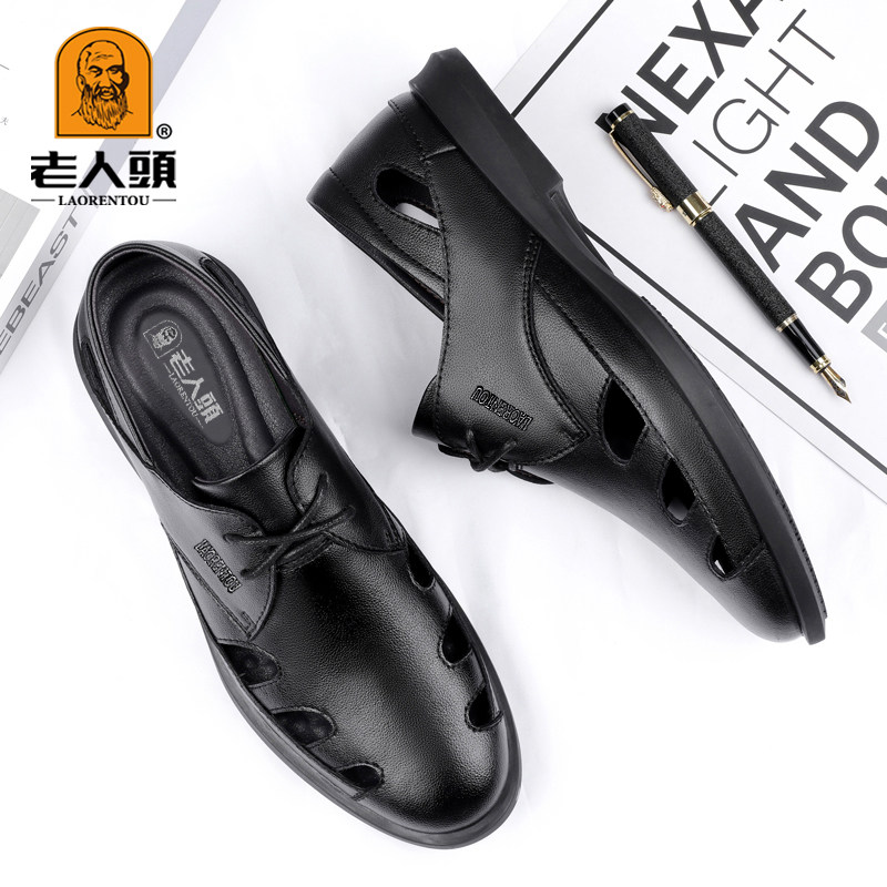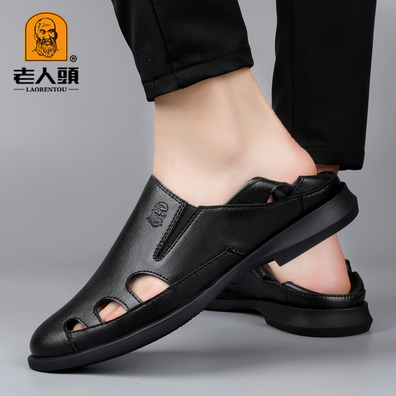 Old man head sandals male summer genuine leather all cowhide soft sole bag head dad sandals thick soles go out to wear Roman sandals