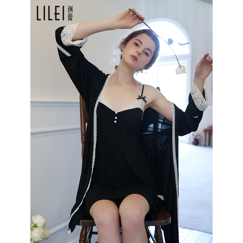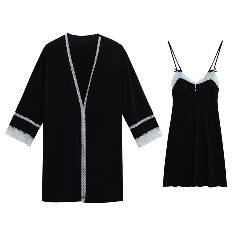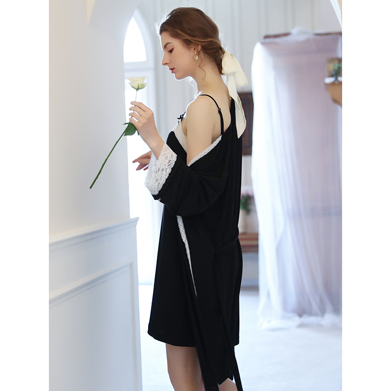Sling nightdress women's two-piece spring and autumn thin lace bow small sex rush warm soft waxy modal pajamas