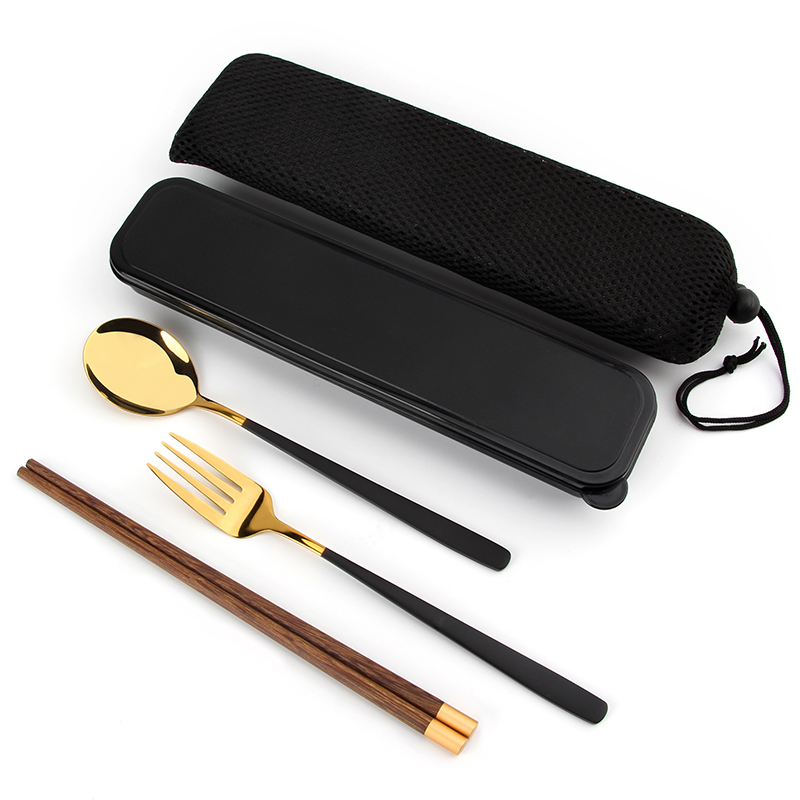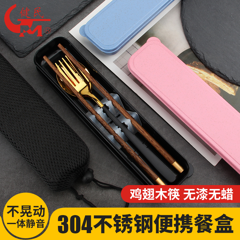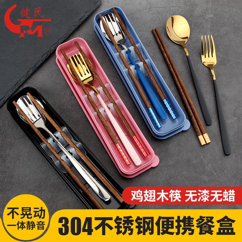 Jianmin chopsticks spoon set Portable tableware Wooden stainless steel fork spoon single boxed outdoor student three-piece set