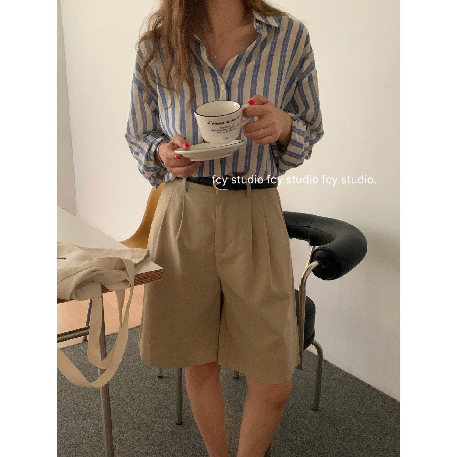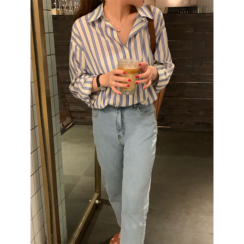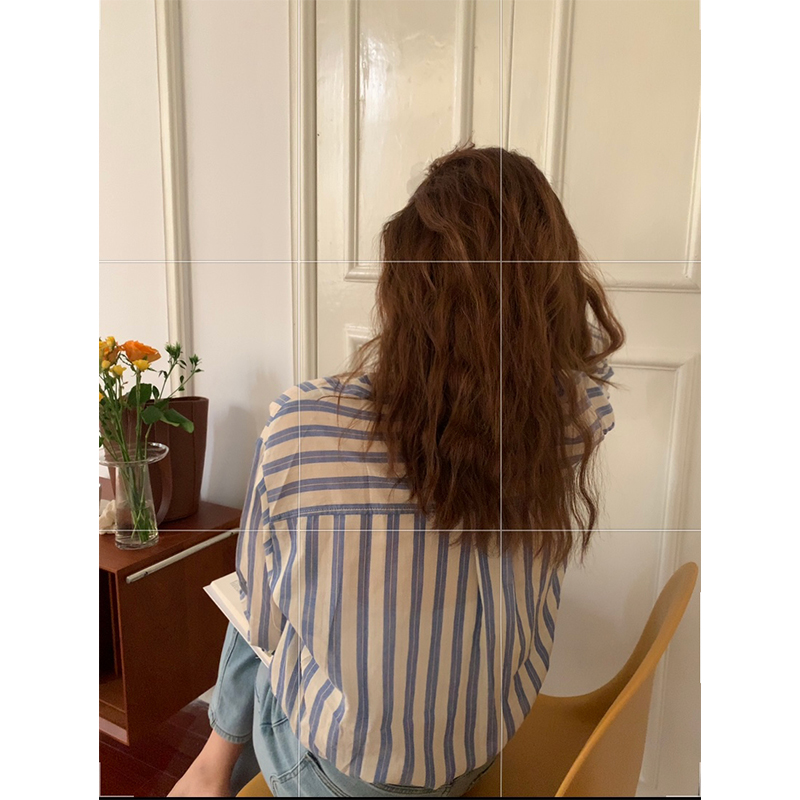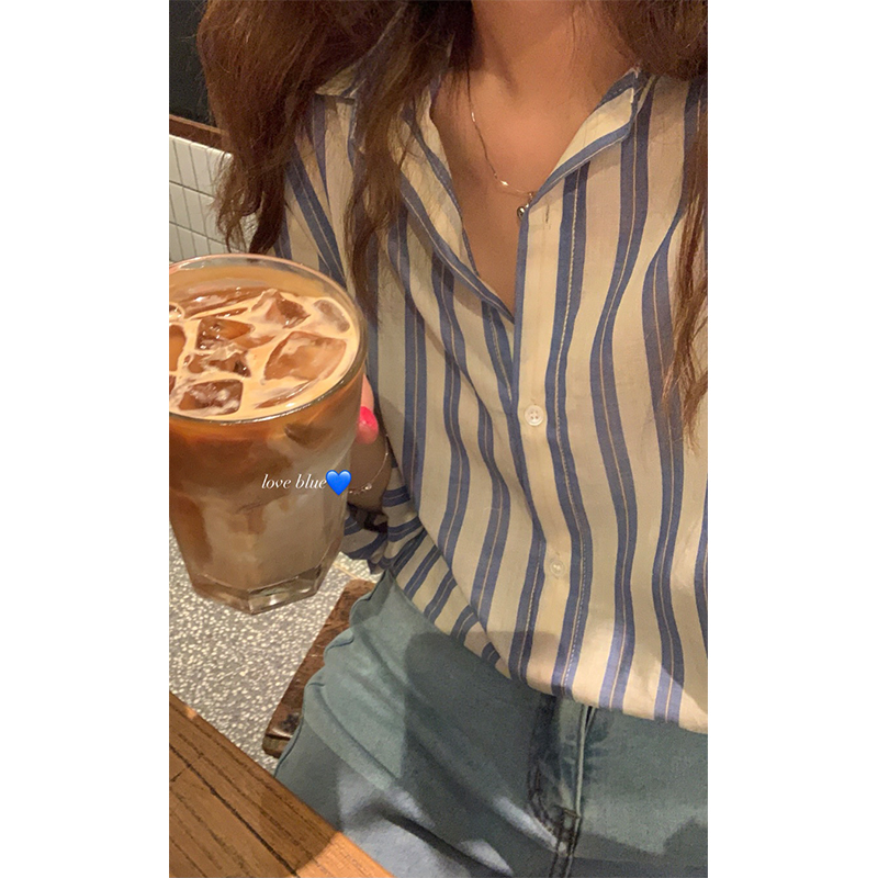FCY Studio Blue Strip Shirt Woman 2021 Summer New Han Design Sense Sleeve Sleeve Sweater