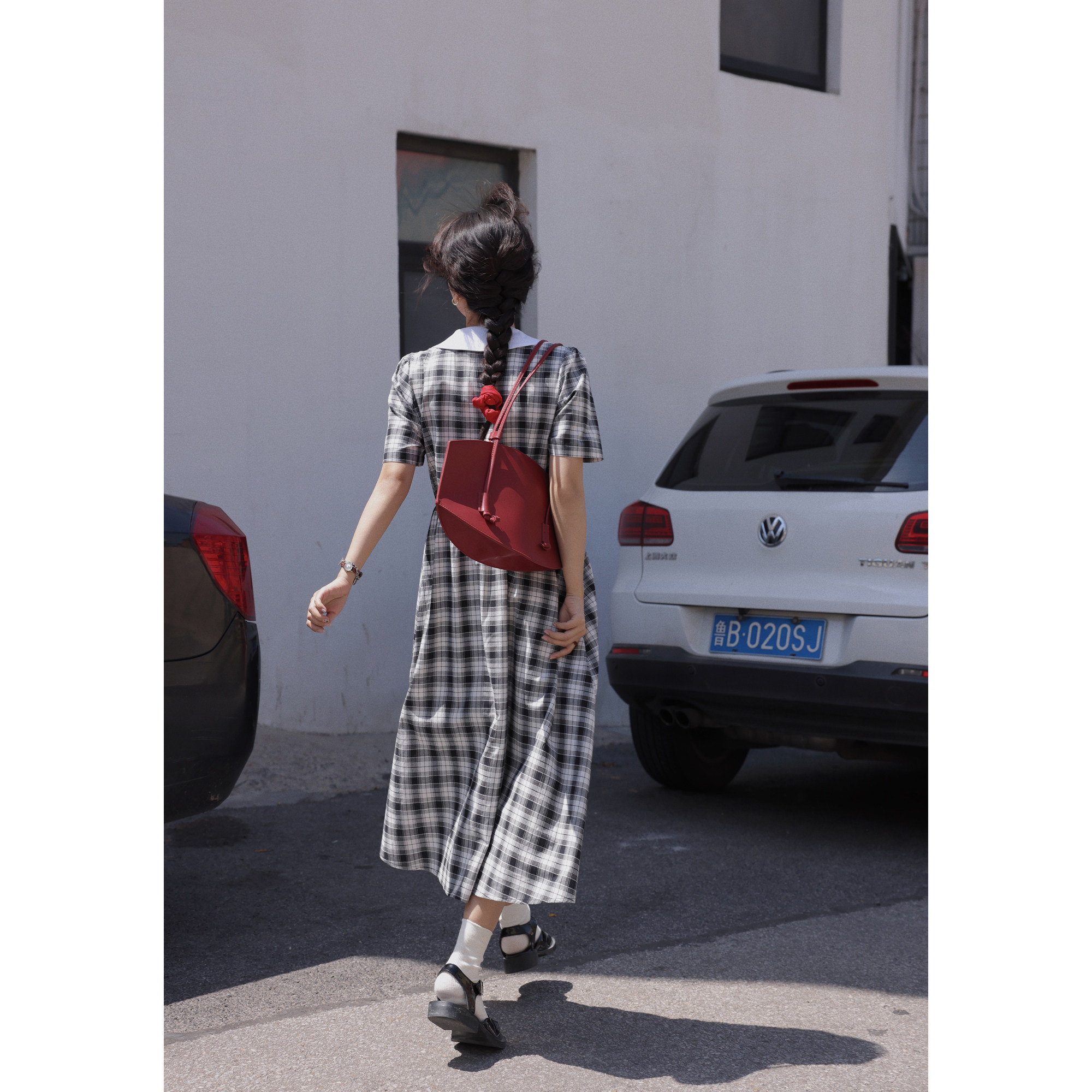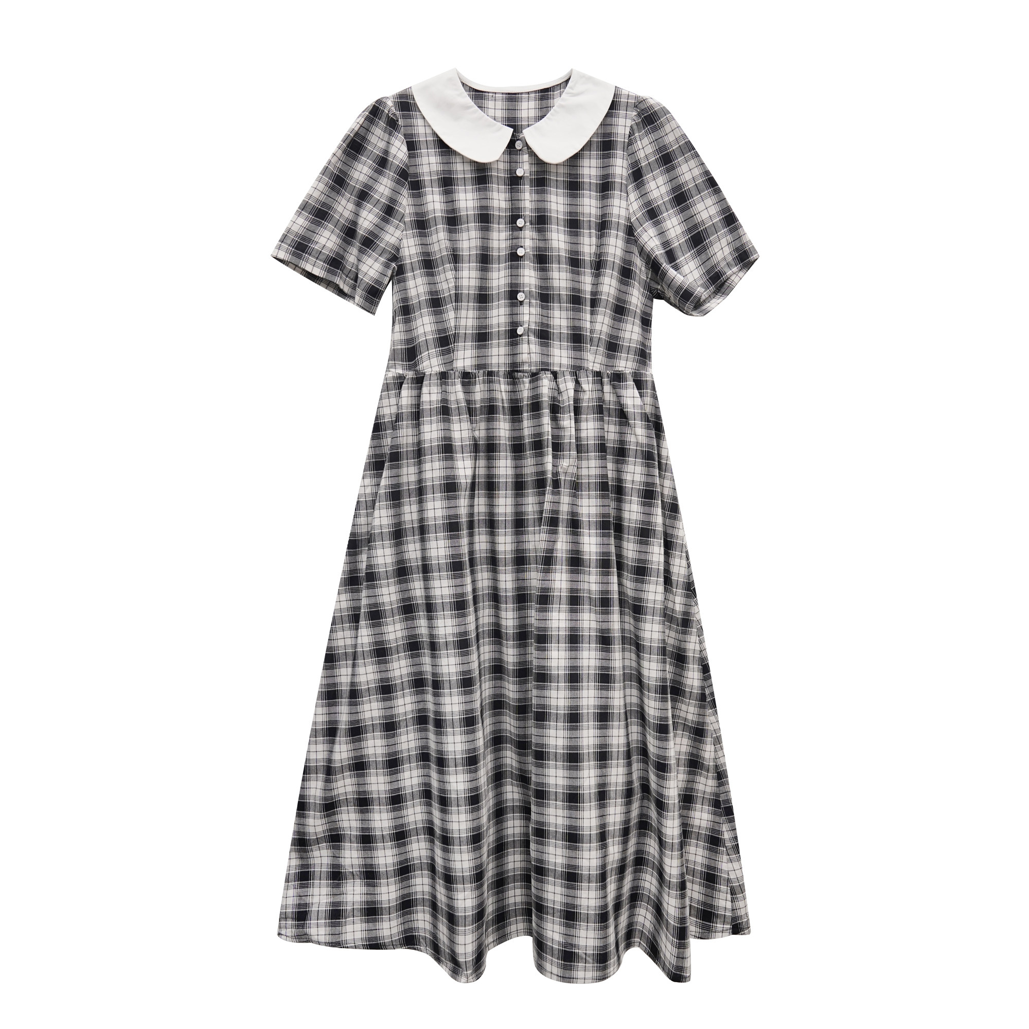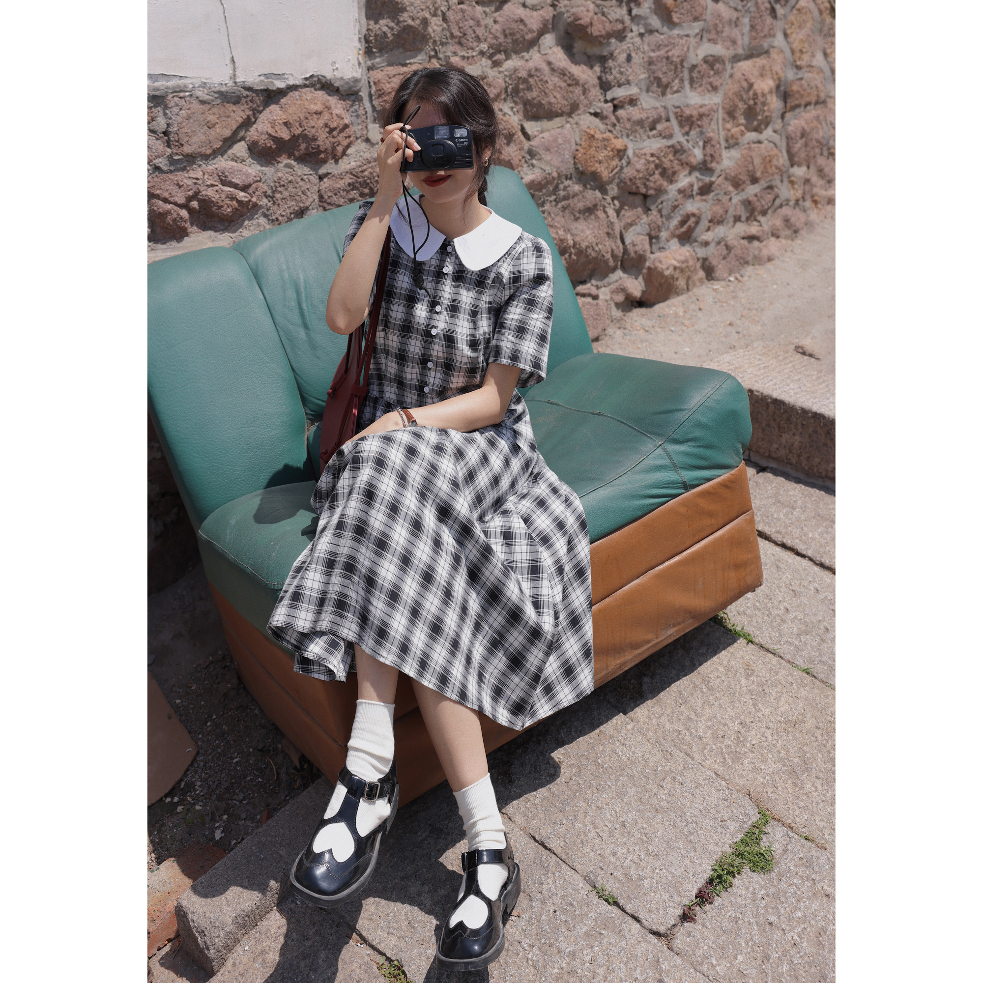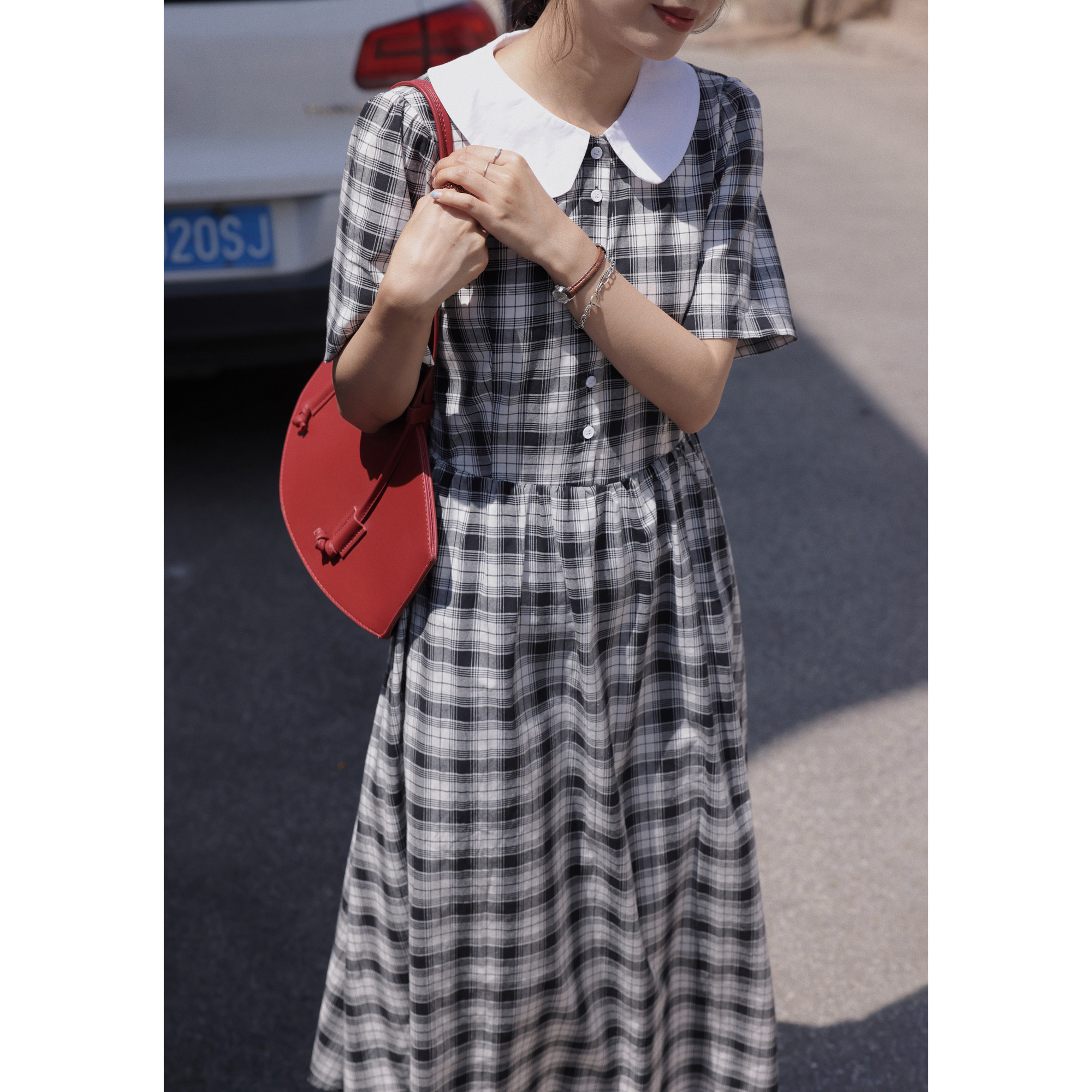 Ouyang Xi College style pattern dress, cute doll collar, waist, high and thin, A-line skirt, Korean skirt, summer