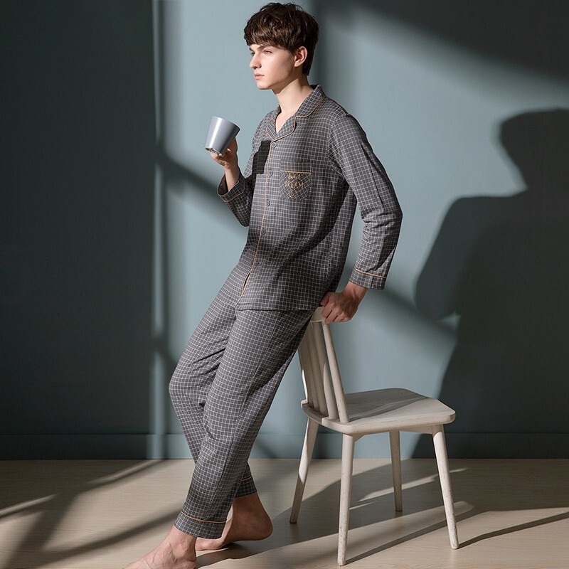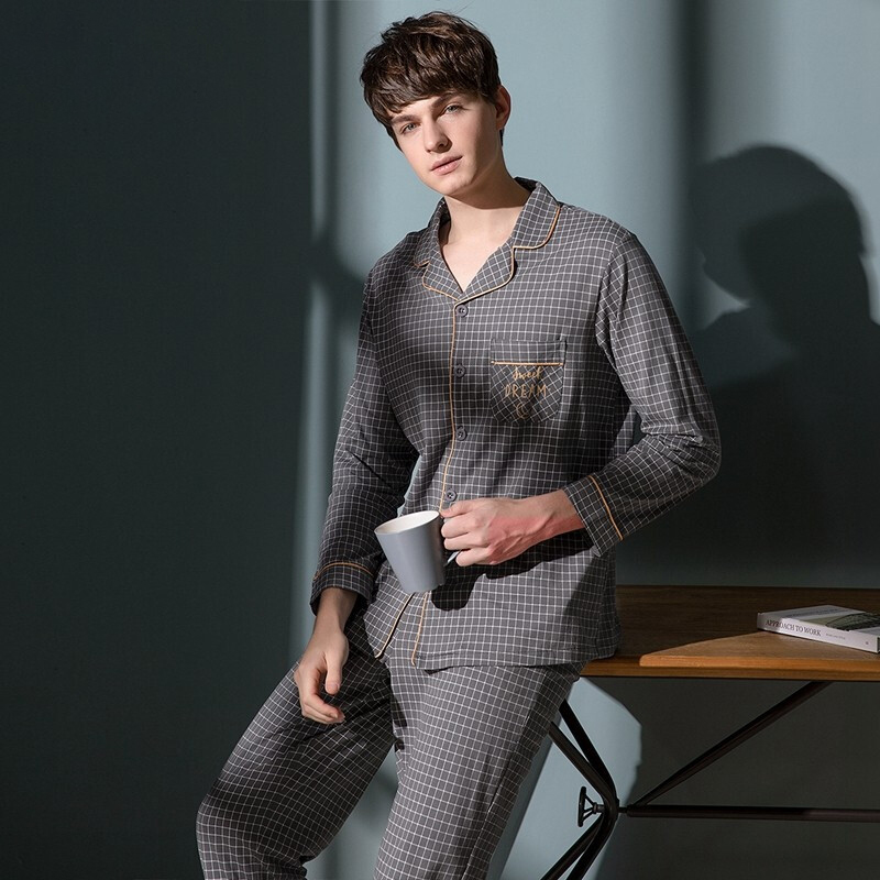 Red Bean Spring Summer New Men's Cotton Long Sleeve Pajamas Men's Small Check Elegant Casual Home Wear Set