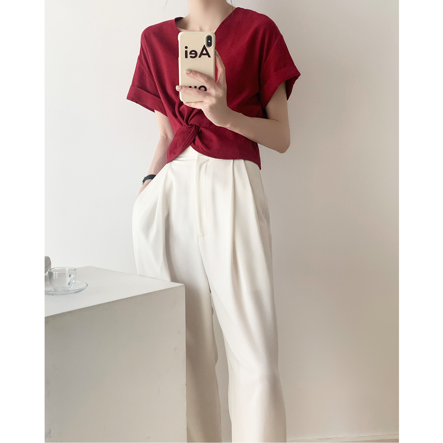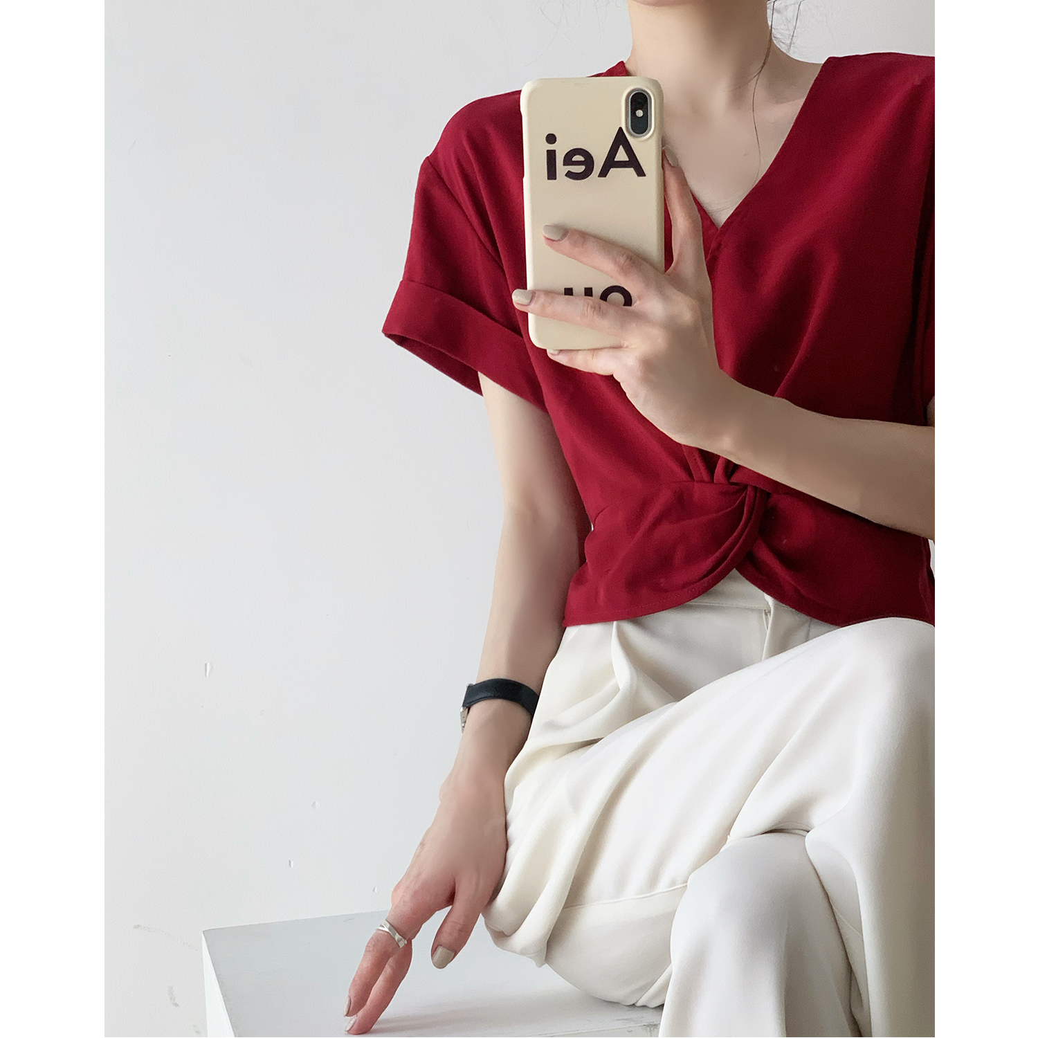 Red short sleeve T-shirt female summer design feeling small crowdknot 100 hitch small sub loose short and don't lock the collarbone blouse