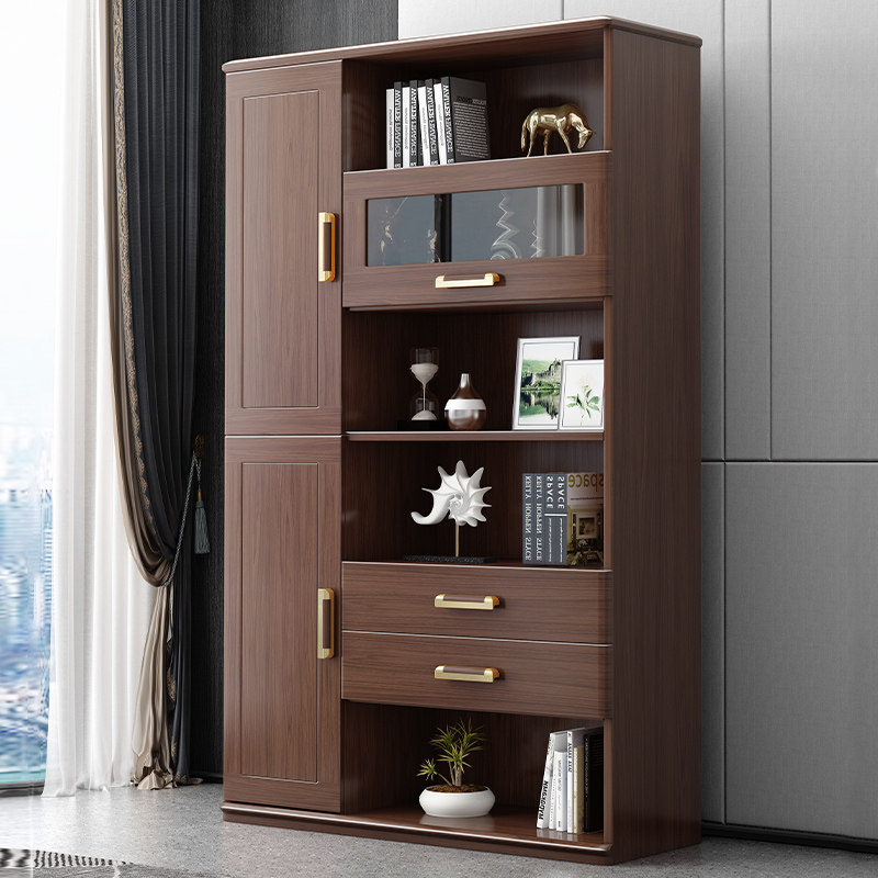 New Chinese-style solid wood bookcase walnut simple modern combination bookshelf study furniture storage cabinet with glass door