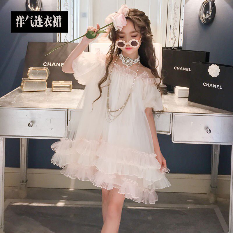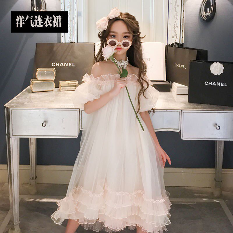 Korean girl one-shoulder princess skirt summer 2021 new style of foreign atmosphere big boy puff sleeve mesh skirt dress