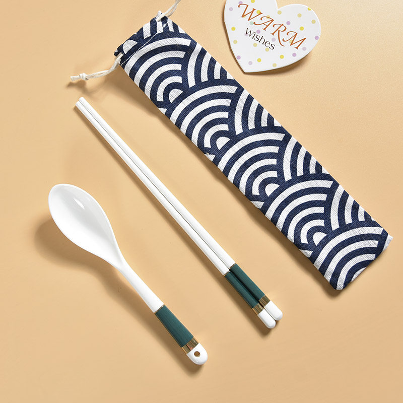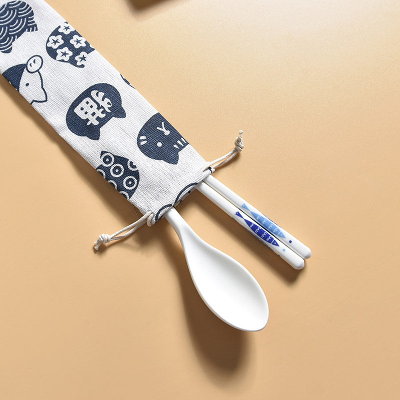 Ceramic portable spoon chopstick cloth bag West Lake blue 1 set of ceramic portable spoon chopstick cloth bag pink gold 1 set of ceramic portable spoon chopstick cloth bag blue star 1 set of ceramic portable spoon chopstick cloth bag Zu mother green 1 set of ceramic portable
