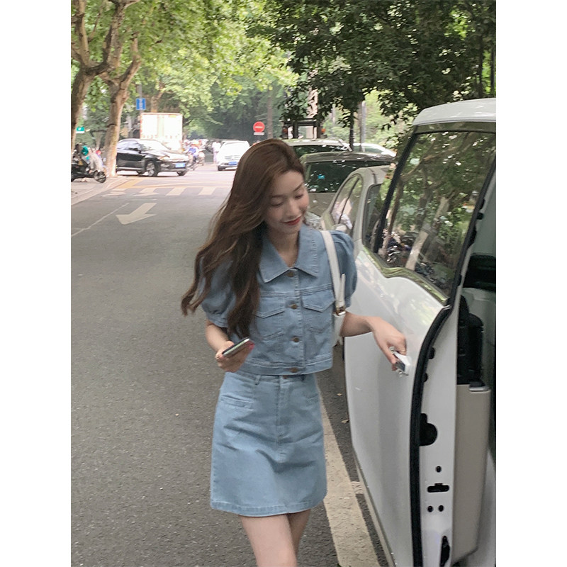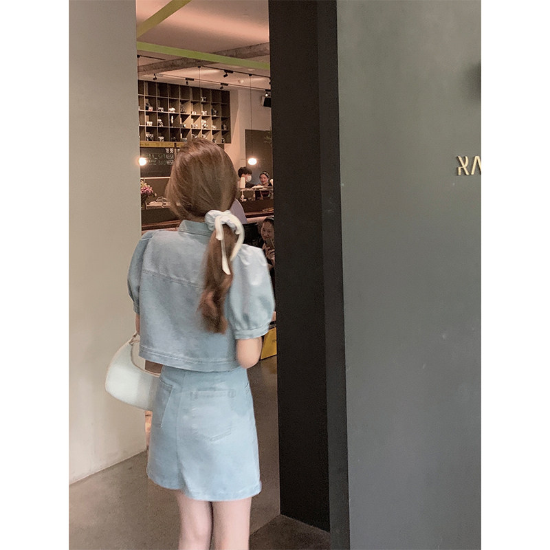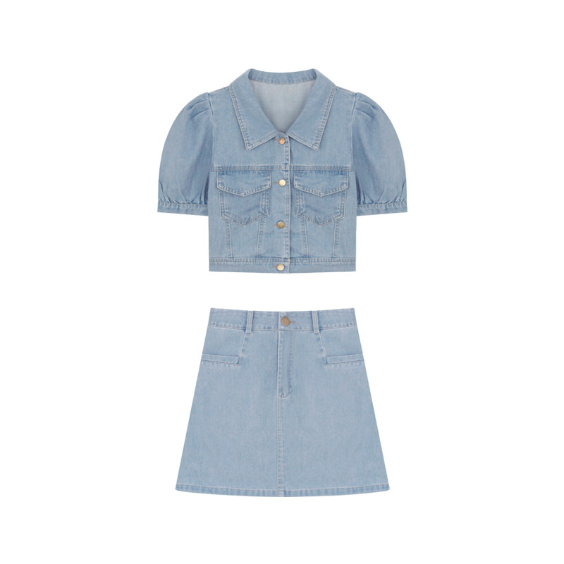 cchen Chen Chen_Retro denim suit women 2022 summer new age-reducing jacket half-length skirt two-piece set