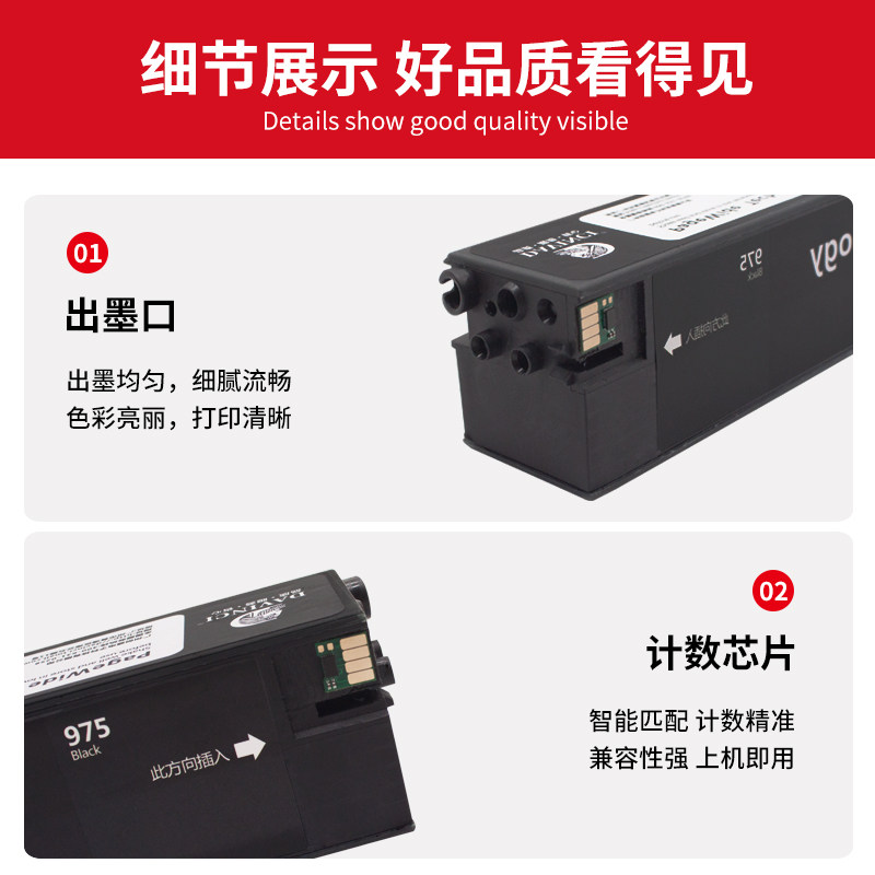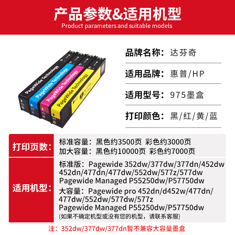 975A Black Standard Capacity (about 3500 pages printed) 975A Red Standard Capacity (about 3000 pages) 975A Yellow Standard Capacity (about 3000 pages) 975A Blue Standard Capacity (about 3000 pages) 975A Standard Capacity 1 set of four colors (1 set is more cost-effective to buy) 975X Black Large Capacity (about 10000 pages) 975X Red Large Capacity (about 7000 pages printed) 975X Yellow Large Capacity (about 7000 pages printed) 975X Yellow Large Capacity (about 7000 pages printed) 975X blue large capacity (about 7000 pages printed) 975X large capacity four colors 1 set (1 set is more cost-effective to buy)
