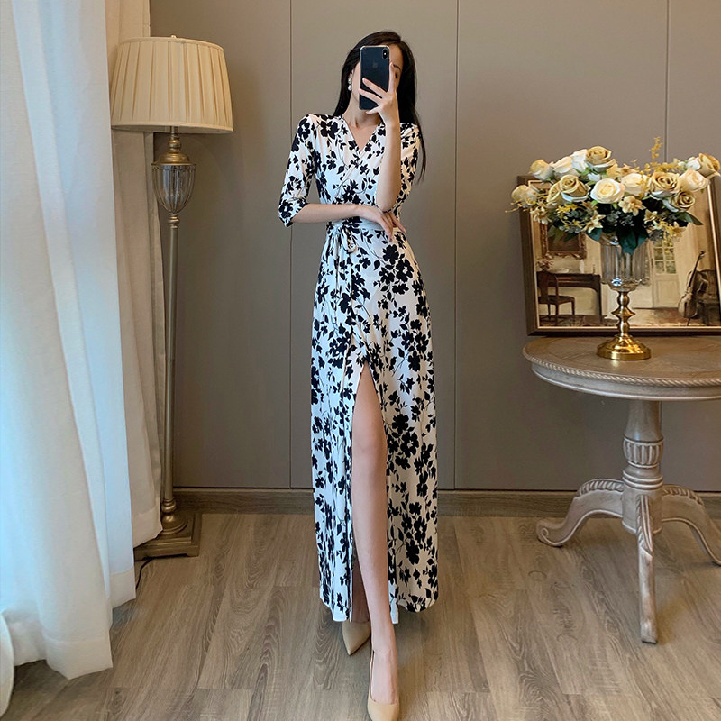 2023 spring and autumn new style temperament collection waist and body slim open fork V collar crushed flower wrap body dress with dress long skirt