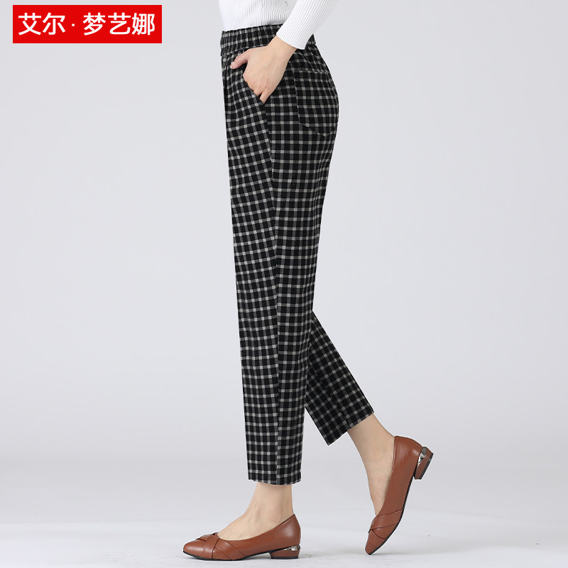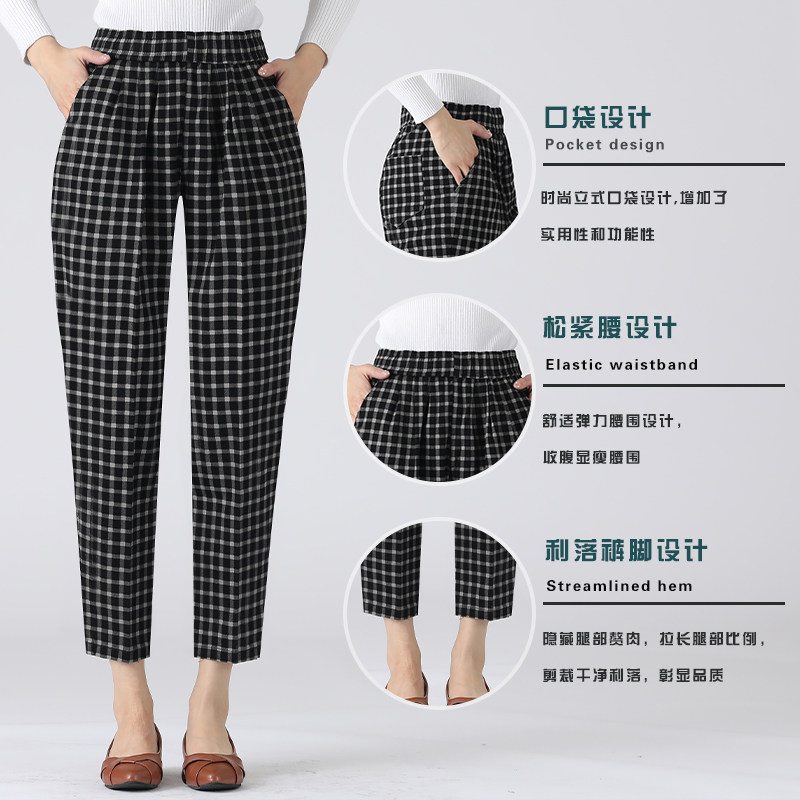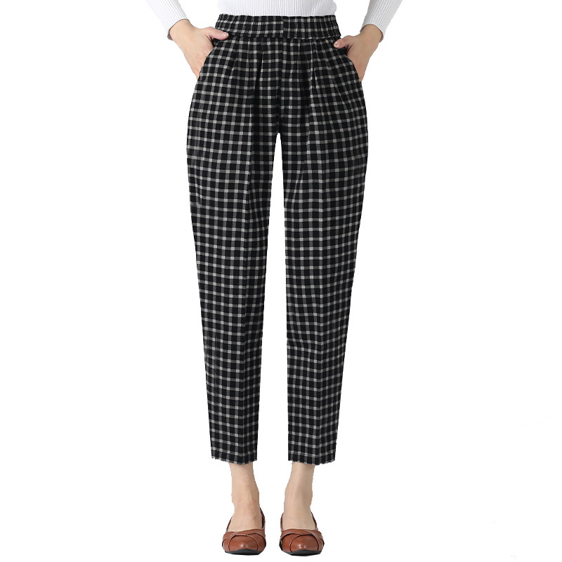 Mom Pants Elastic Waist Summer Thin Plaid Harem Pants Middle-aged High Waist Western Style Luo Pants Middle-aged and Elderly Women's Pants
