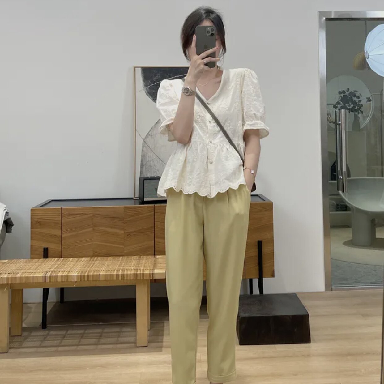 Xinxinjia's new exquisite embroidery positioning lace V-neck doll shirt summer French puff sleeve temperament women's top