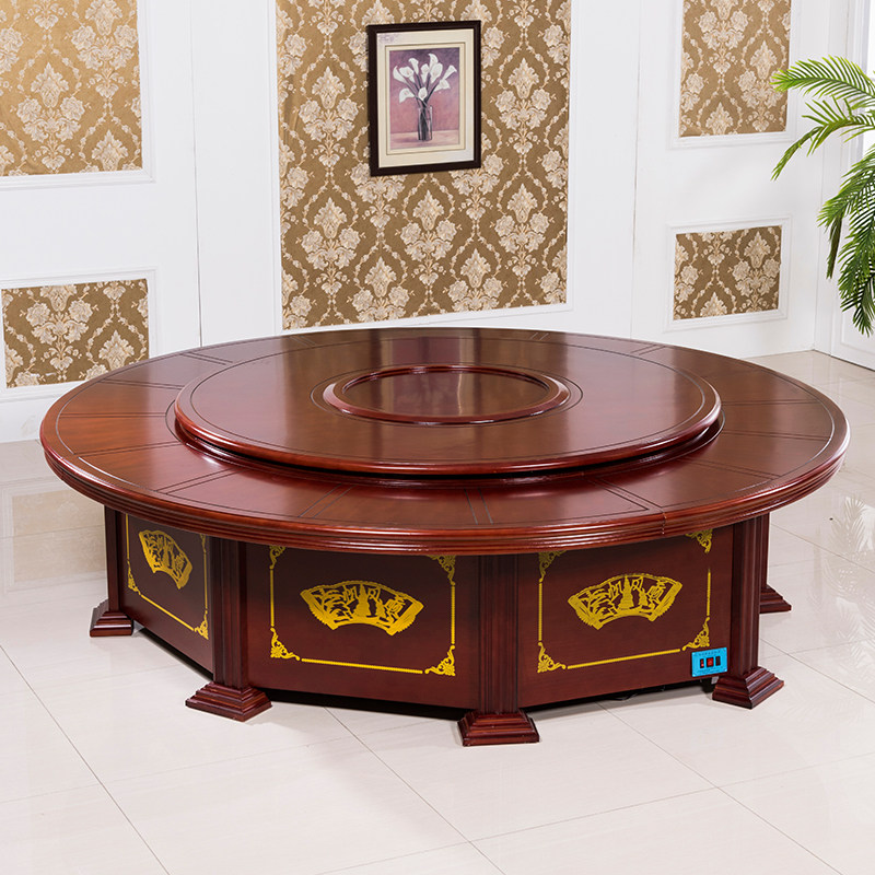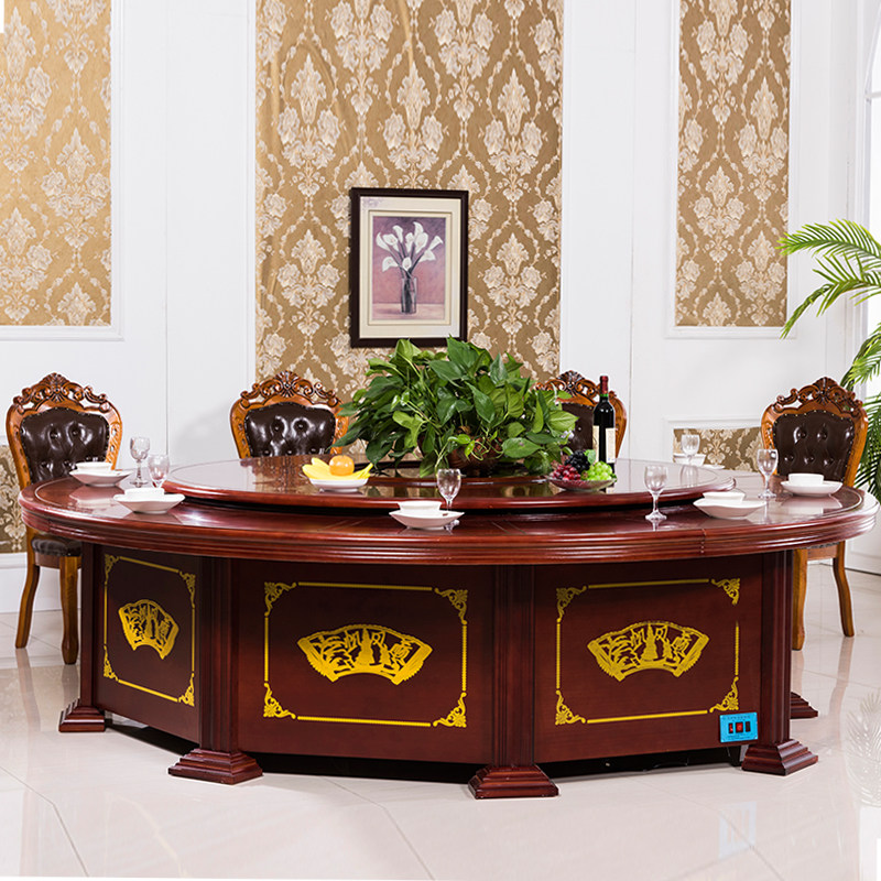 Hotel electric large round table dining table 15 people new Chinese-style box round solid wood commercial dining room restaurant table and chair combination