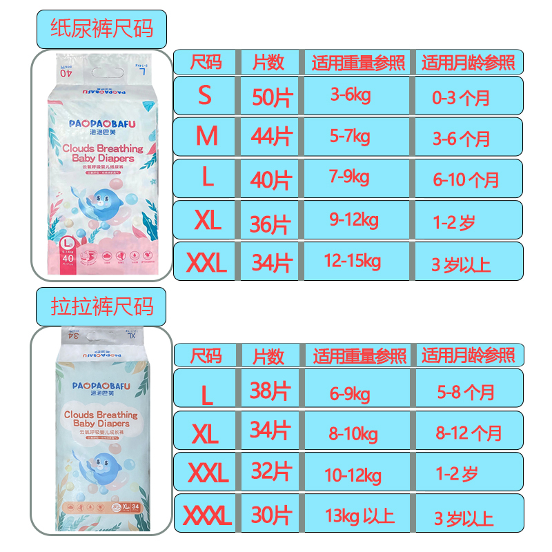 Size S diapers Size M diapers Size L diapers Size XL diapers XXL size pull-up pants L size pull-up pants XL size pull-up pants XXL size pull-up pants XXXL size