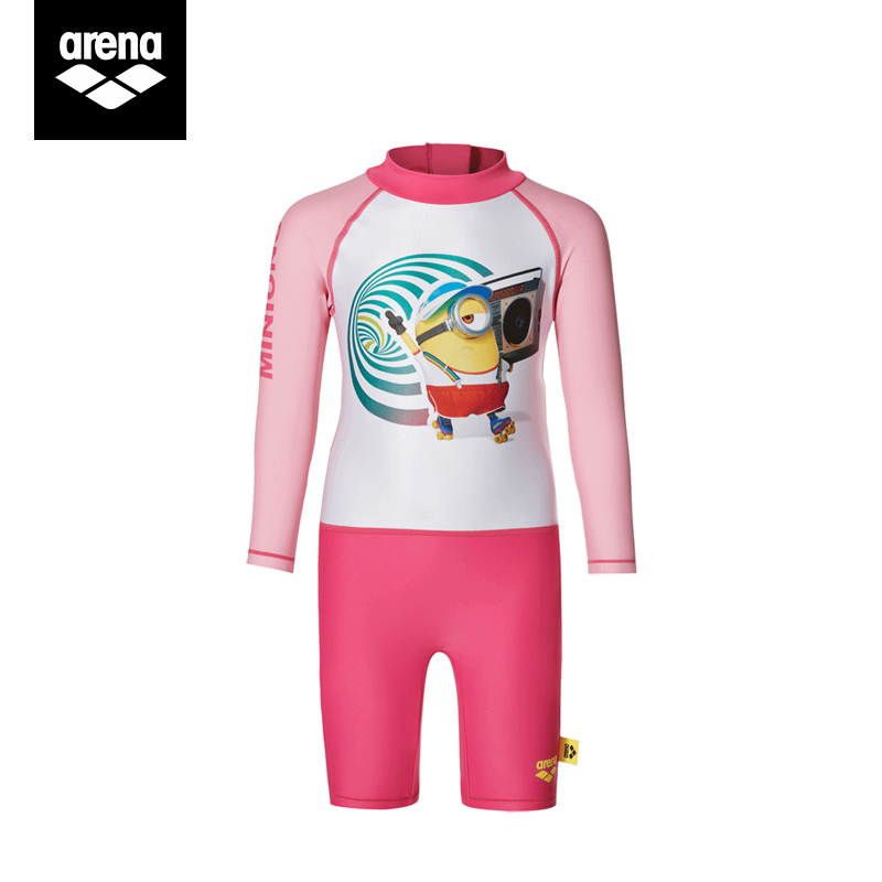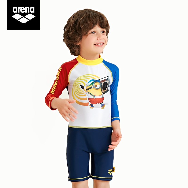 arena arena Arina little yellow children's conjoined five-point swimsuit boys and girls long sleeve sunscreen cartoon printing quick-drying