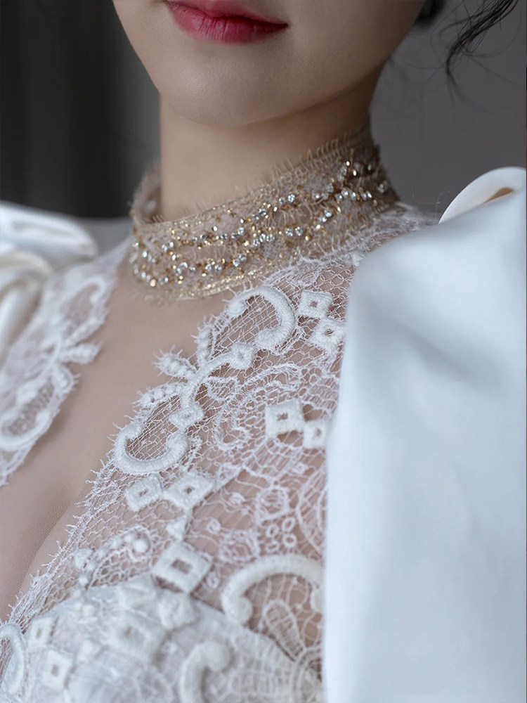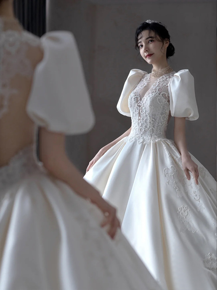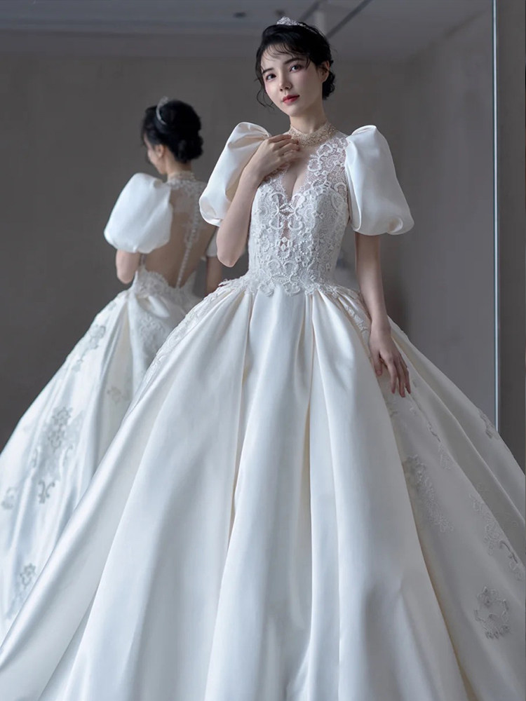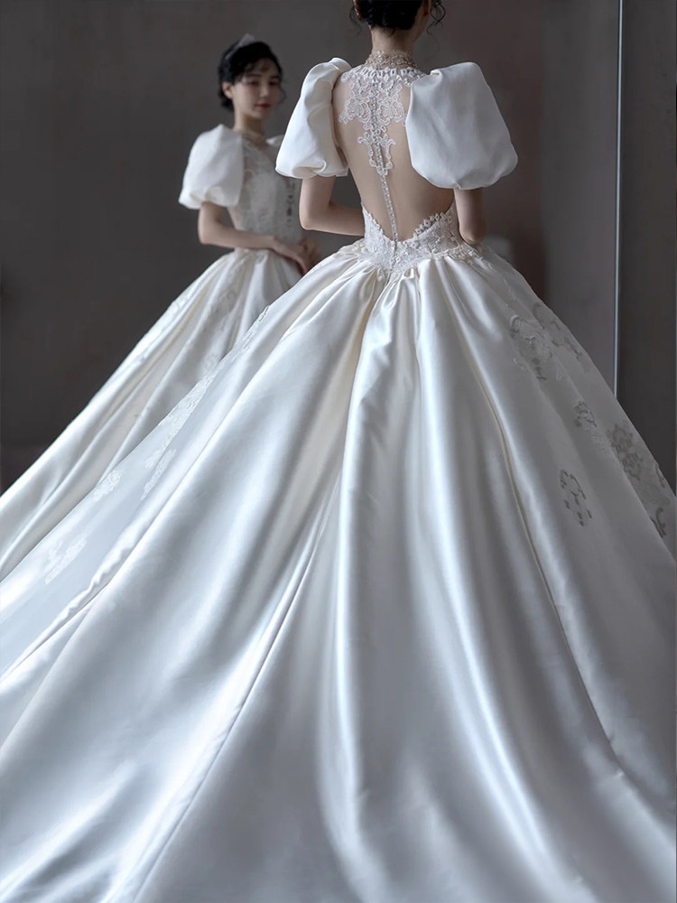 Satin wedding dress 2021 new bride French temperament high-end retro simple court style thin tail out of the yarn