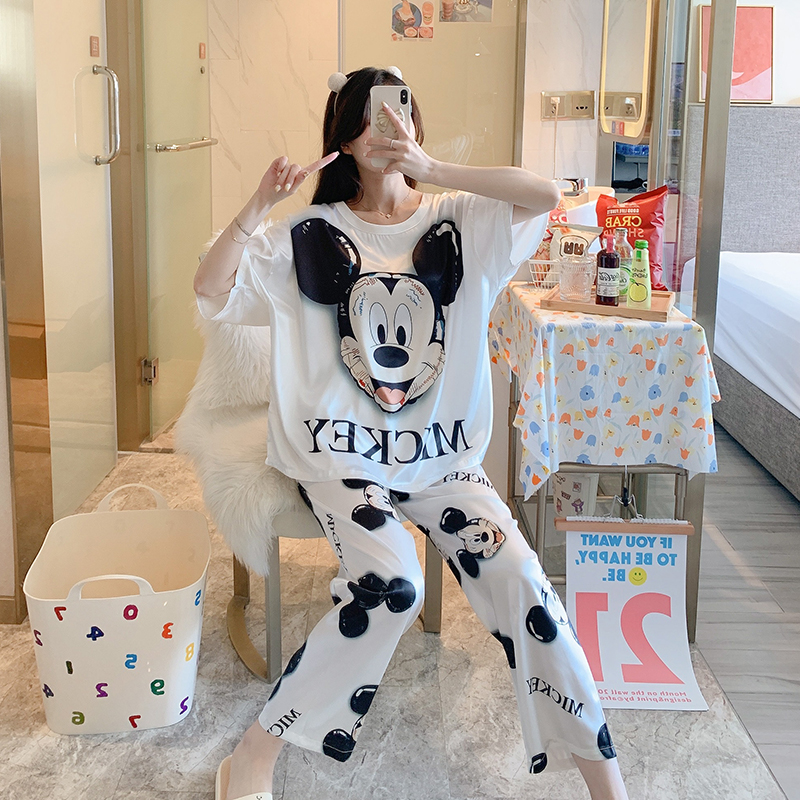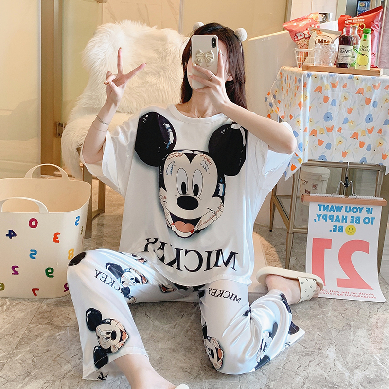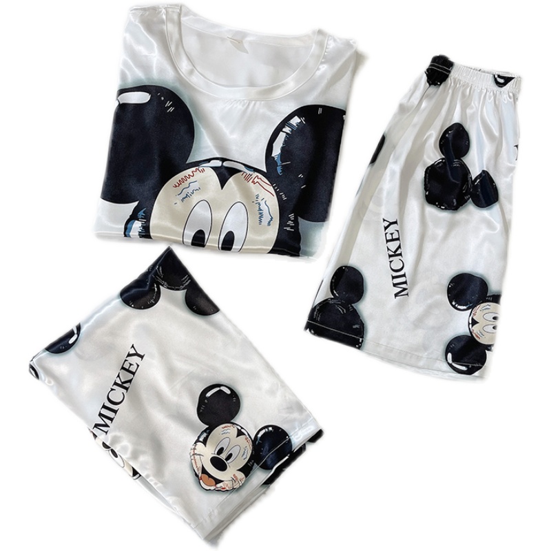 Pajamas Woman 2021 New Summer Ice Silk Slim short sleeves Cute Cartoon Mickey Three Sets Home Suit Suit