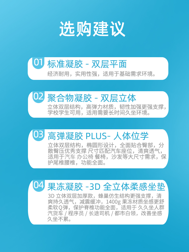 The following products are provided with original cloth cover No need for additional standard gel Double-layer plane I prefer softer polymer gel Stronger support Double-layer three-dimensional high-elastic version PLUS Ergonomic caudal vertebra
