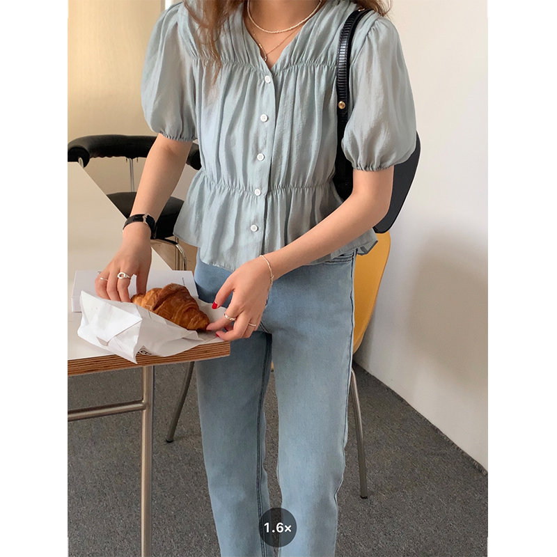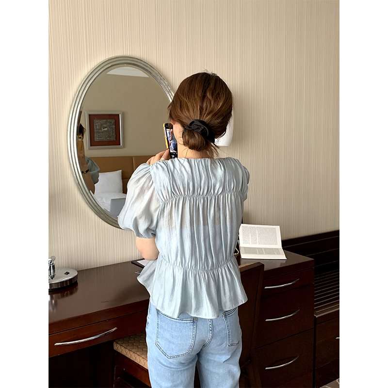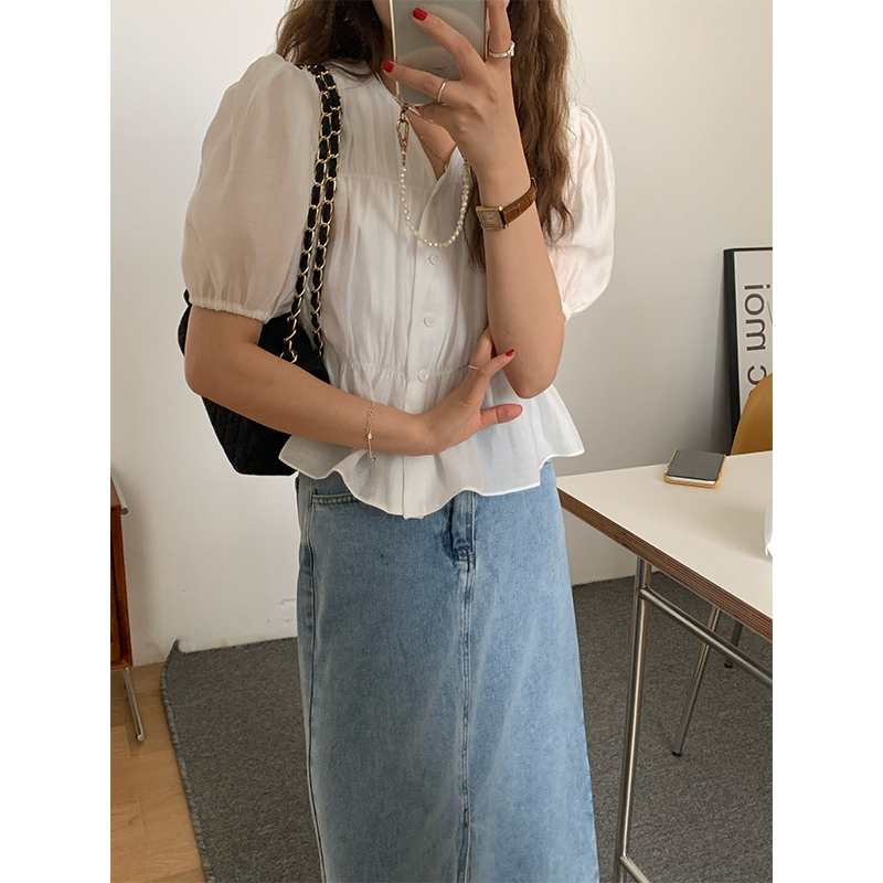 FCY studio white puff sleeve shirt women 2021 summer new Korean style temperament design short-sleeved shirt