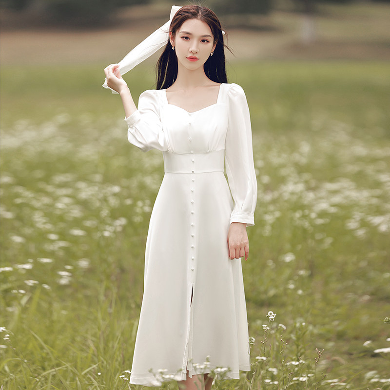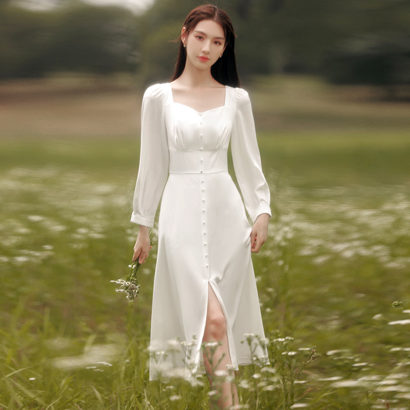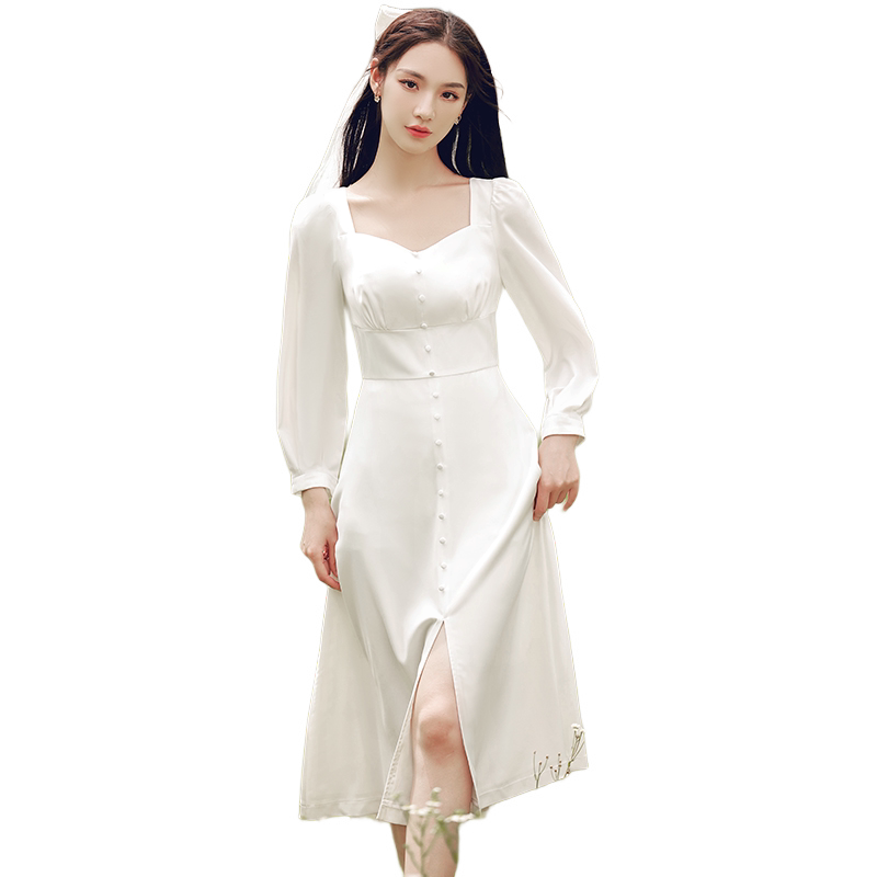 French retro white dress can be worn at ordinary times for registration and engagement Satin Sen light gauze travel dress