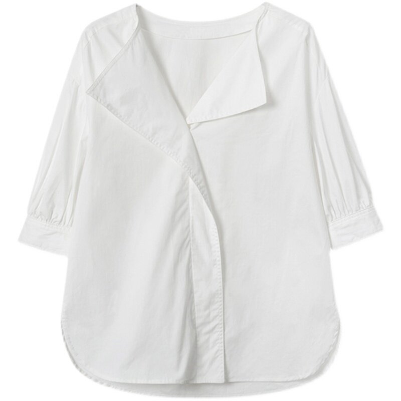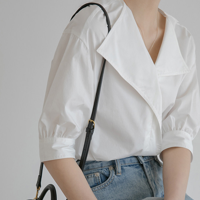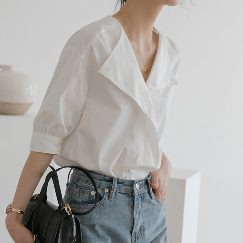 White Shirt Woman Summer 2022 New Design Feel Port Wind V collar shirt short sleeve French style Don't make a blouse temperament