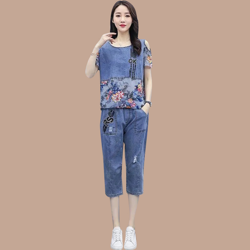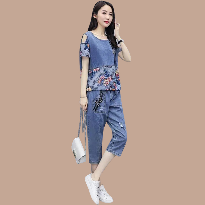 European Station fashion sports suit women's summer 2021 new large size loose denim seven-point pants casual two-piece tide